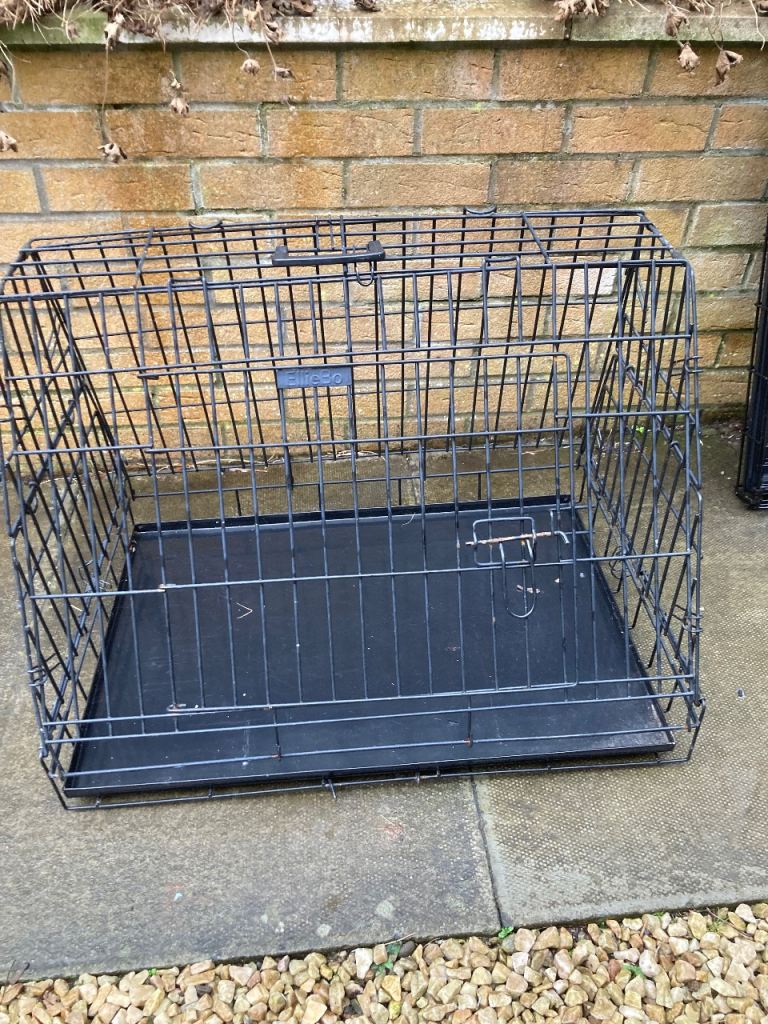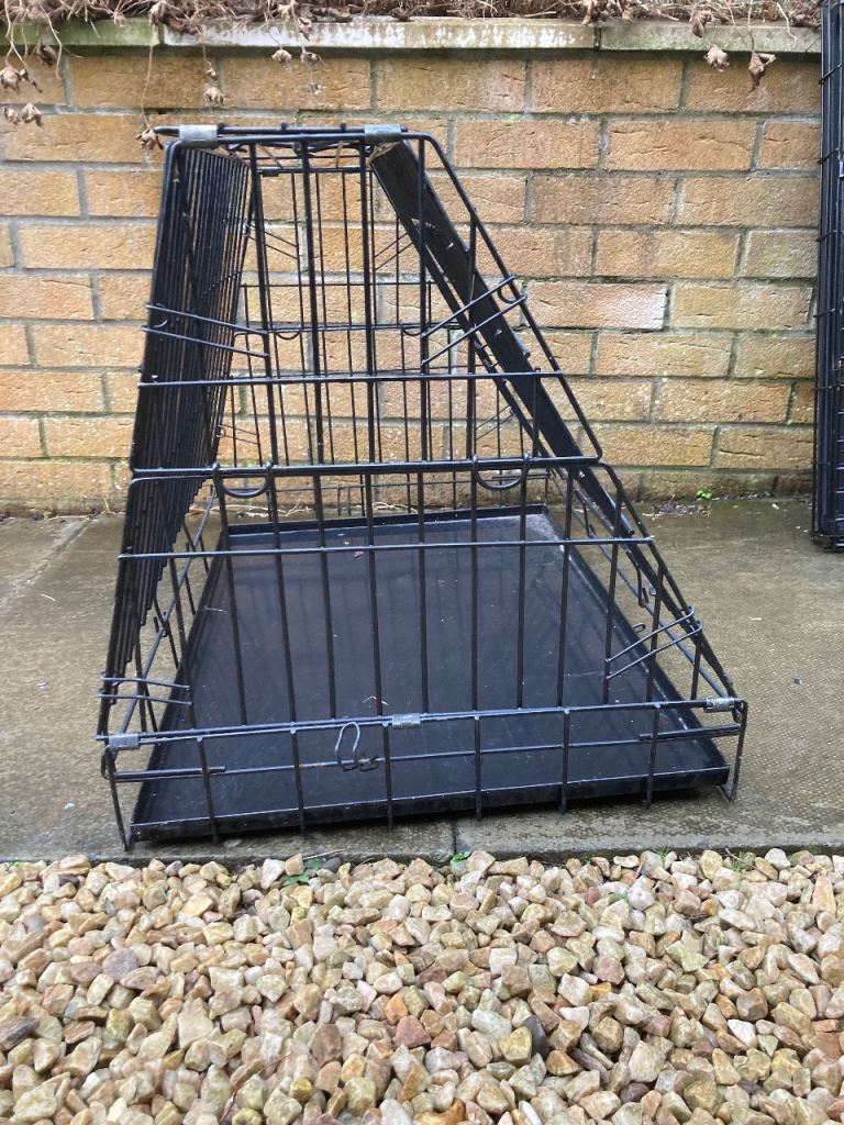 Slanted dog crate - 54c54x76cm. Galvanised steep frame. Single door with heavy duty L-shaped latch. Folds flat. Removable steel tray. Takes up much less room but still good height room for puppy/dog. Slight superficial rust around latch but efficacy not affected at all.