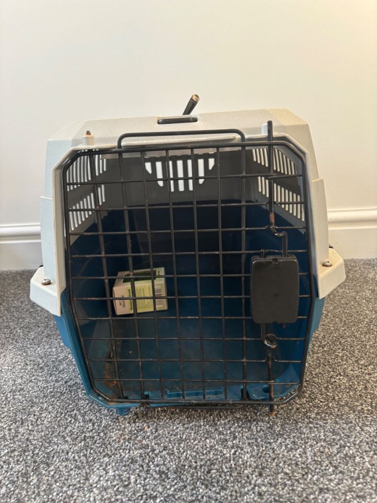 Used but good condition, crate door lock in working order. Comfortably fits a small dog or a cat.