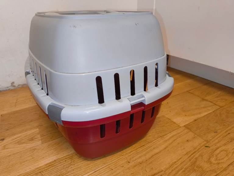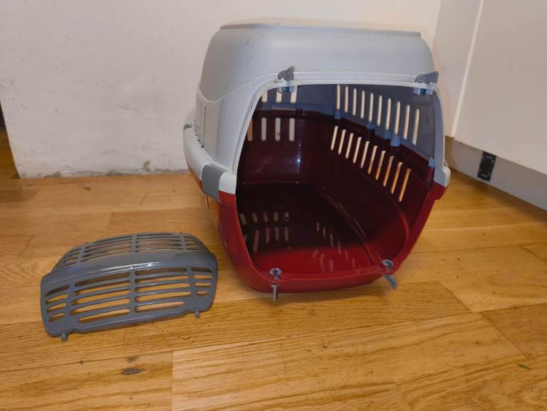 Portable basket designed for small pets, with handle and gate. Used in good condition, one clip missing.