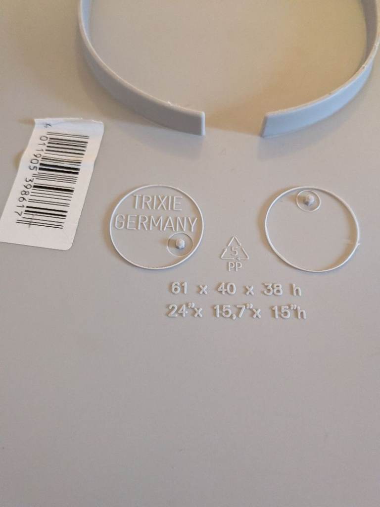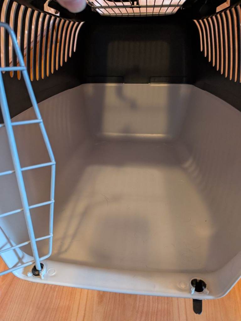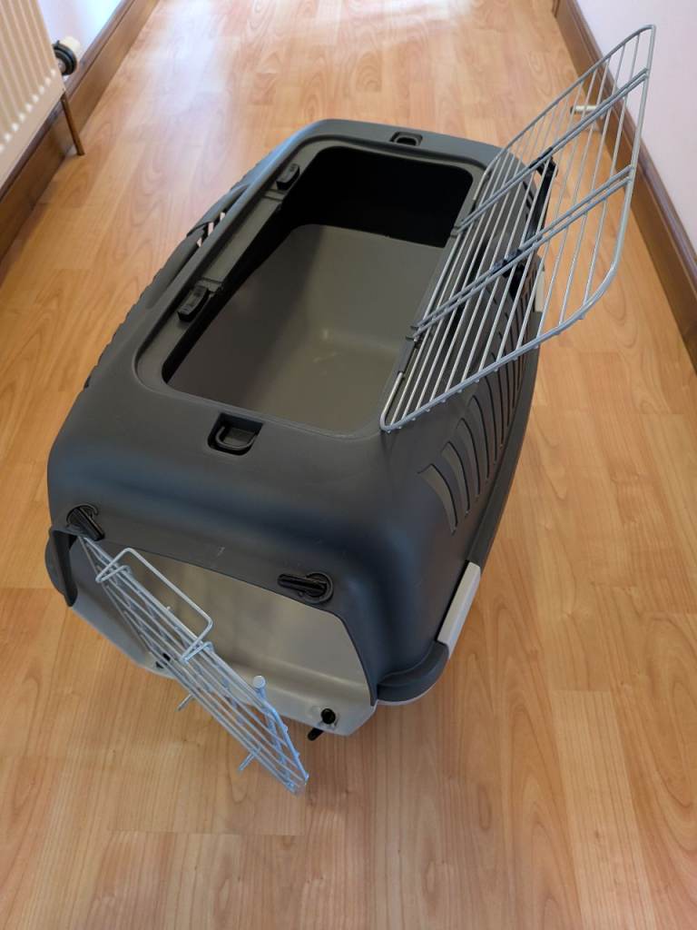 Suitable for transporting small animals with a maximum weight of 12kg. Plastic body(easily cleaned). Metal door & carry handle. Metal grille on top(ideal for anxious animals). Ventilation slits on both sides. Can be secured with car seat belt. Grey & light grey. 24" x 15.7" x 15"H VGC - only used for Vet appointments.