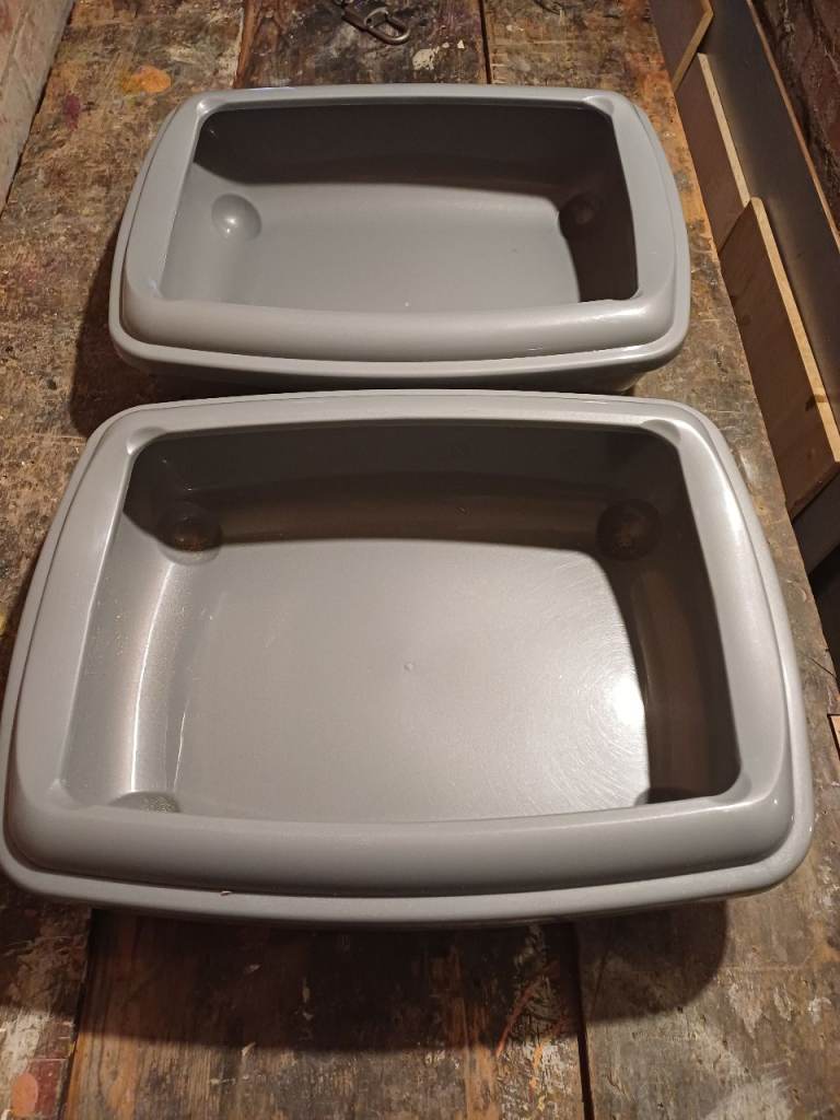 Posting for 2+ yearsTwo plastic medium pet litter trays with rims
