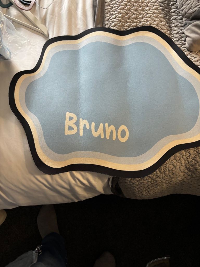 I have a personalised large dog blanket & a food mat in blue the name on it is Bruno , they are brand new .