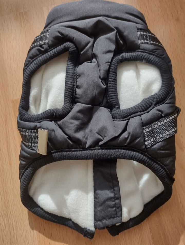 Length approx 13" chest 18" neck 12" It is water/shower proof and fleece lined. It also has an attached harness and top zip fastening