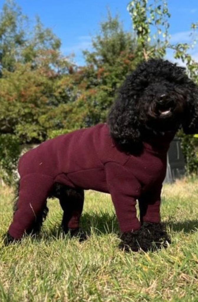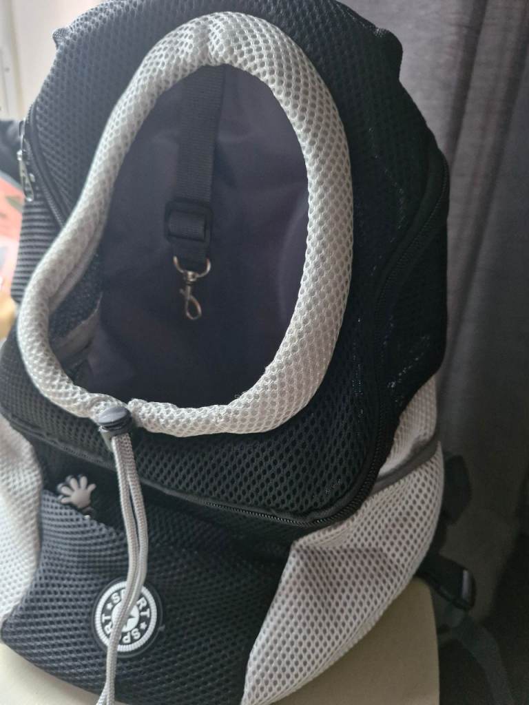 Soft grey furry lining and has Velcro fastenings at front and under belly.