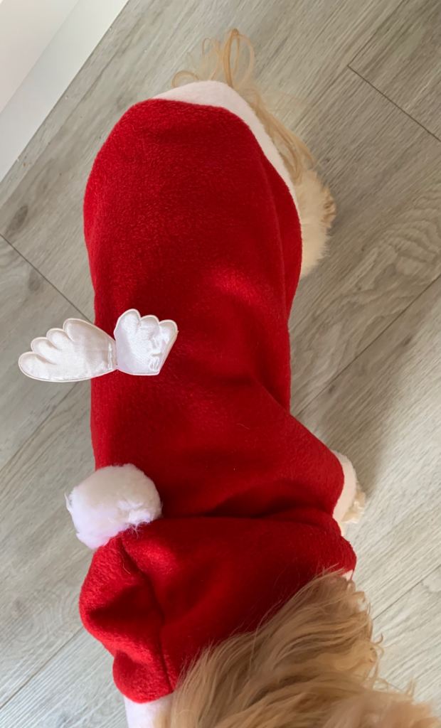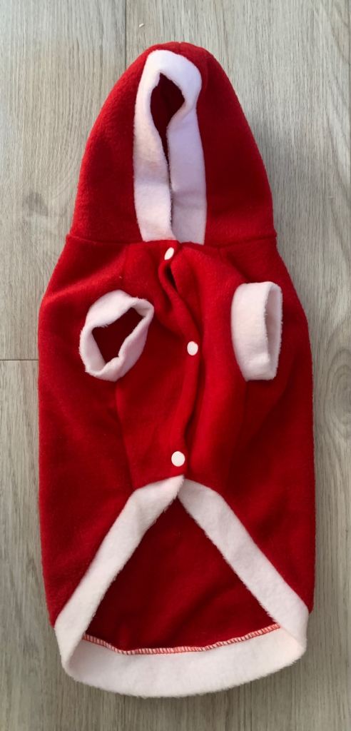 Santa fleece dog outfit with Velcro fastening, ideal to wear outside ideal for a medium size dog, the chest measures 42cms the length from the neck to tail is 52cms it’s in vgc