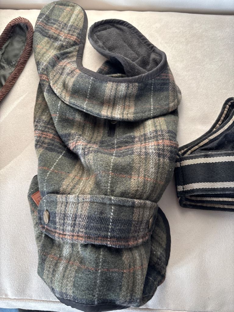 A black waterproof and wind proof coat , plus a warm green check dog coat plus a Huntleys dark reversible check coat. Just £2 each or all for just £5