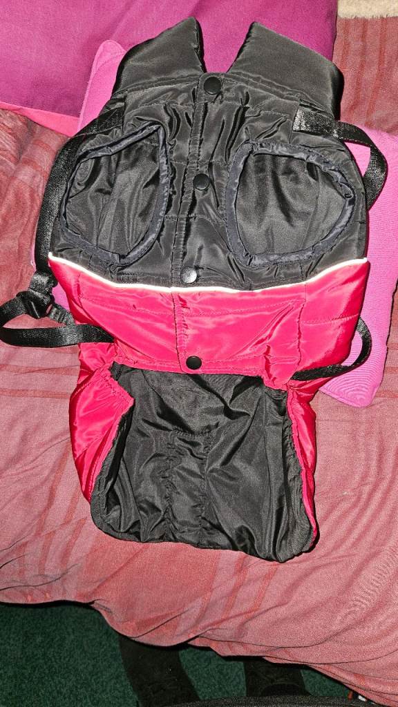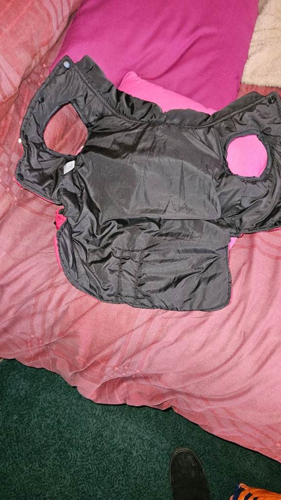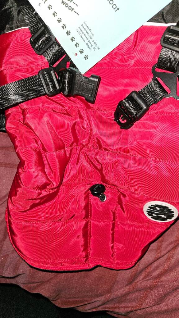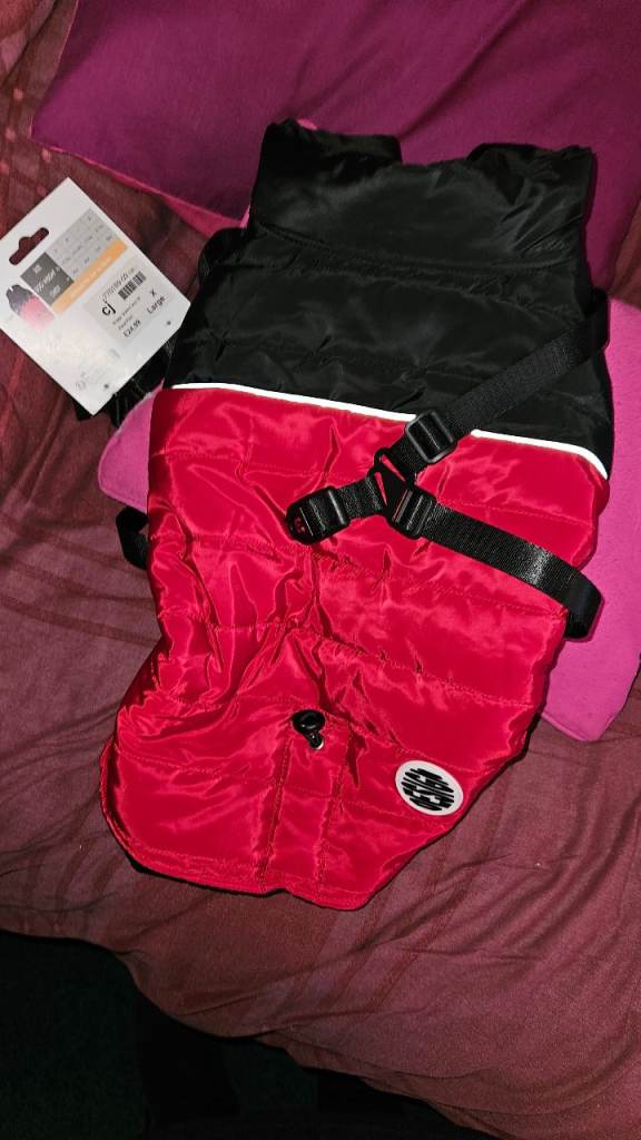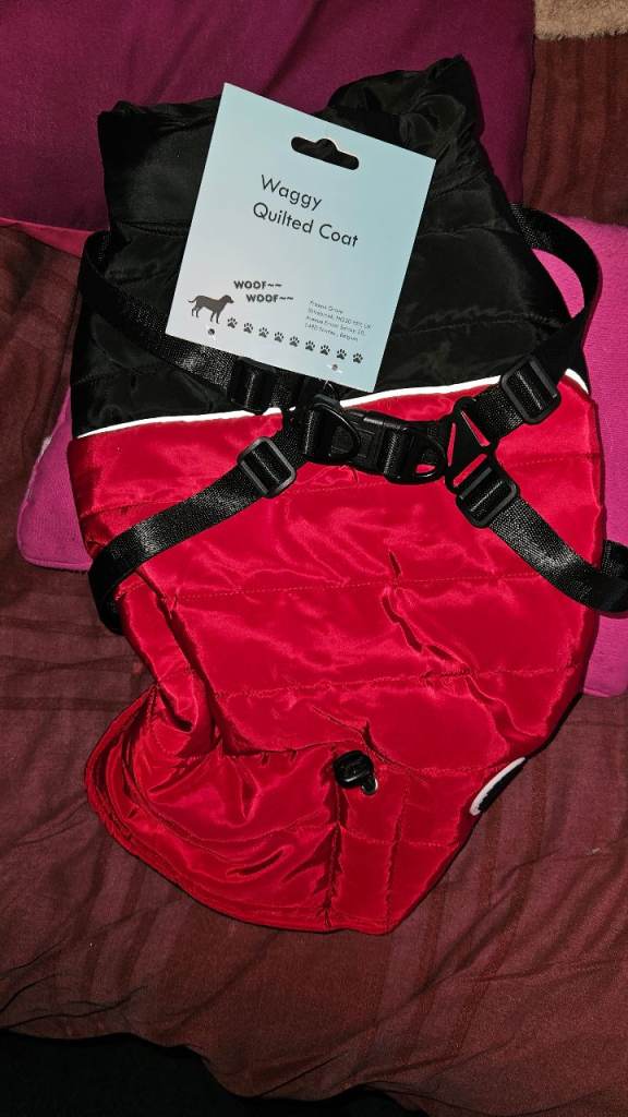 I bought this Waggy Red,black Quilted coat for my dog but when it came I saw it straight away that I new that it wouldn't fit my dog at all,with this Quilted coat you don't need to put a harness on them at as it has got one on there which I think it is fantastic,there is the tag on there still with the size chart so for the weight is XL 8-11 kg Chest is -58 cm,it still has the tag on there as well.