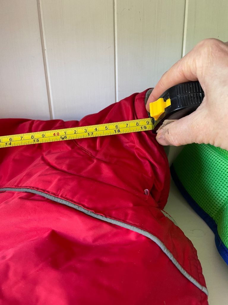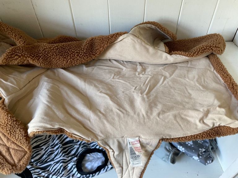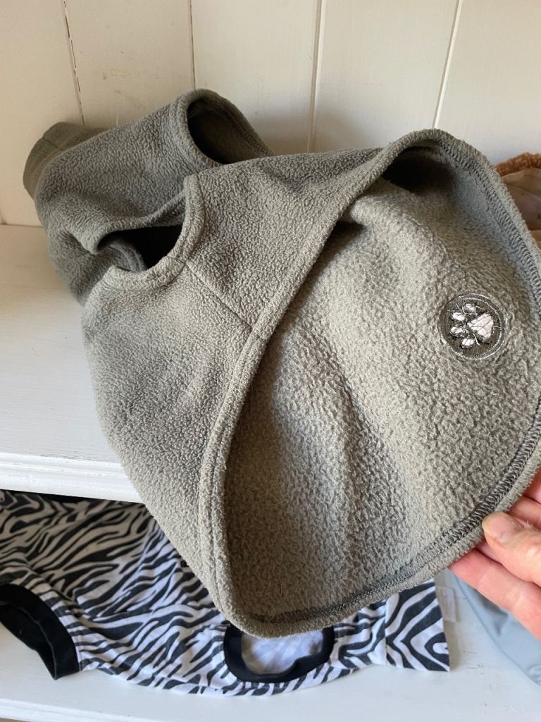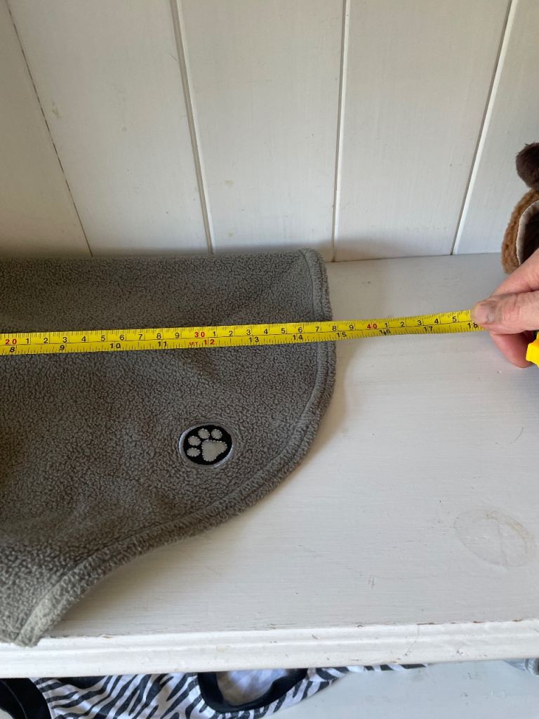 4 different coats: red fleece lined raincoat 19” length from top of neck to tail; Xmas coat by H & M with soft lining and antlers 15”; small grey jumper 15” and lastly, black and white medical suit to protect dogs tummy during recovery from spaying op - fastens under tail. This worked brilliantly for our young 1 yr old whippet 19” nape to tail. Open to offers, happy to post.