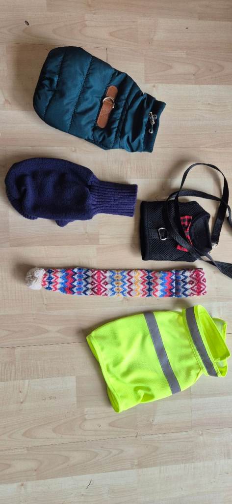 A lovely bundle of accessories perfect for a miniature dachshund puppy (up to 3 months) or any very small dog.