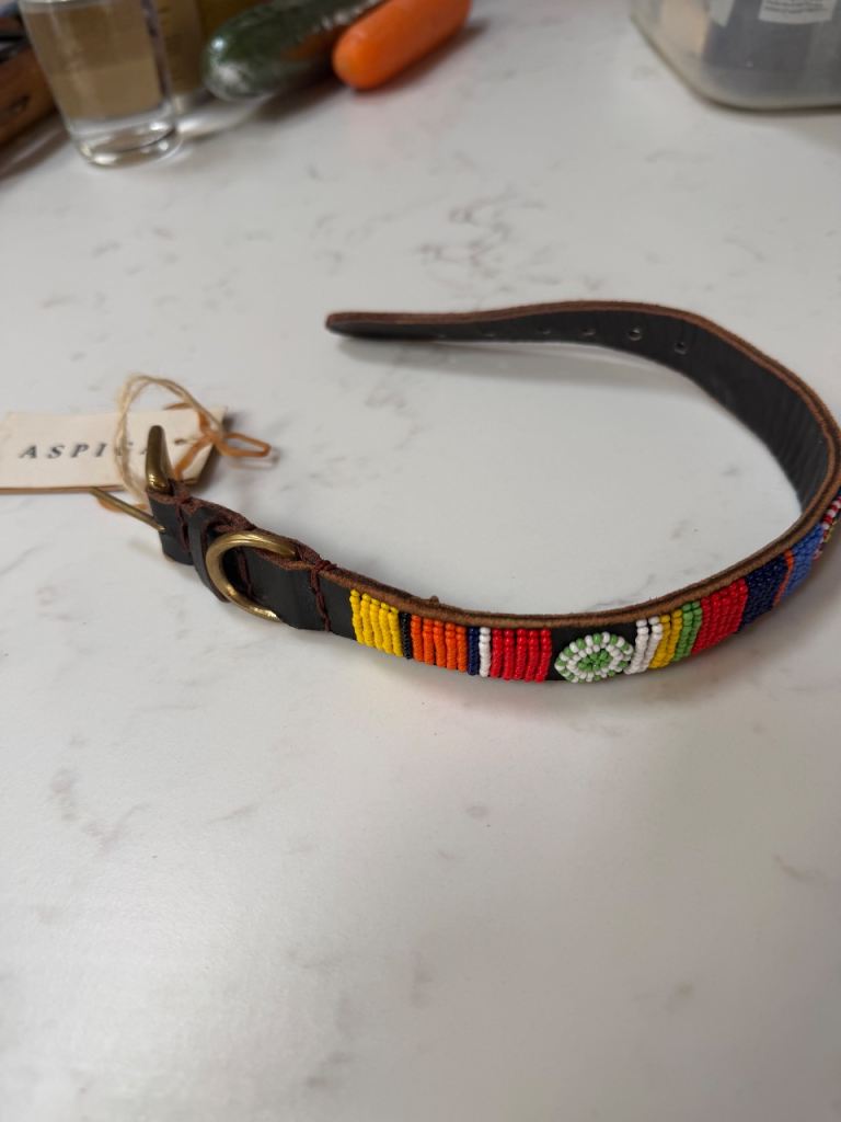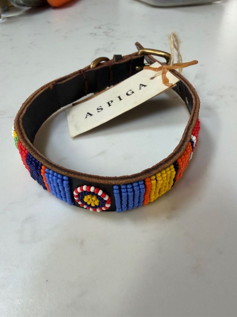 Never worn. Too small for my dog , a plump cocker spaniel. All leather with African beadwork. 30-31cm from bottom of buckle to 3rd ( middle) hole in leather