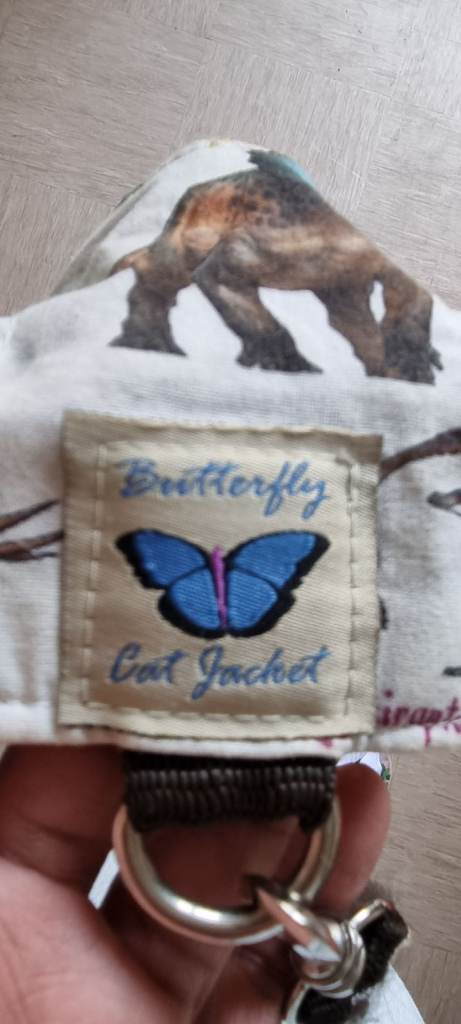 Pet harness with dinosaur print and butterfly logo.