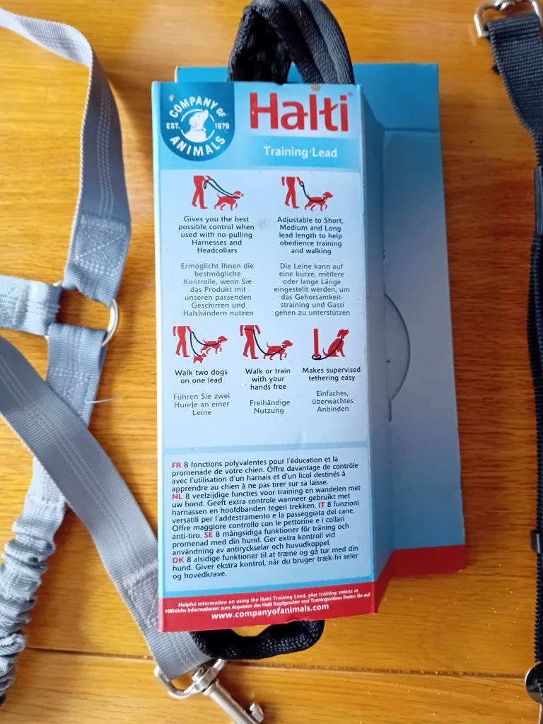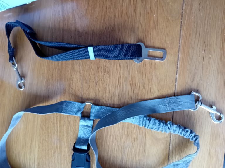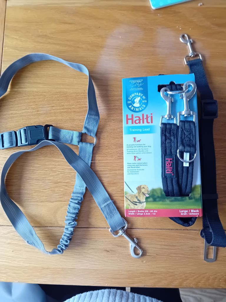 Dogs lead and car seat belts used a few times, £10 for the three items. Grey belt fits around head rest in car. Black belt fits a Ford car both have adjustable lengths. Halti never used bought from Pets at home. It has multiple functions used for extra control on a no pull harness. Can be used for a single length lead . Length 6ft width 1in soft grip material. Collection only please.