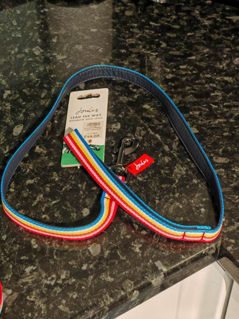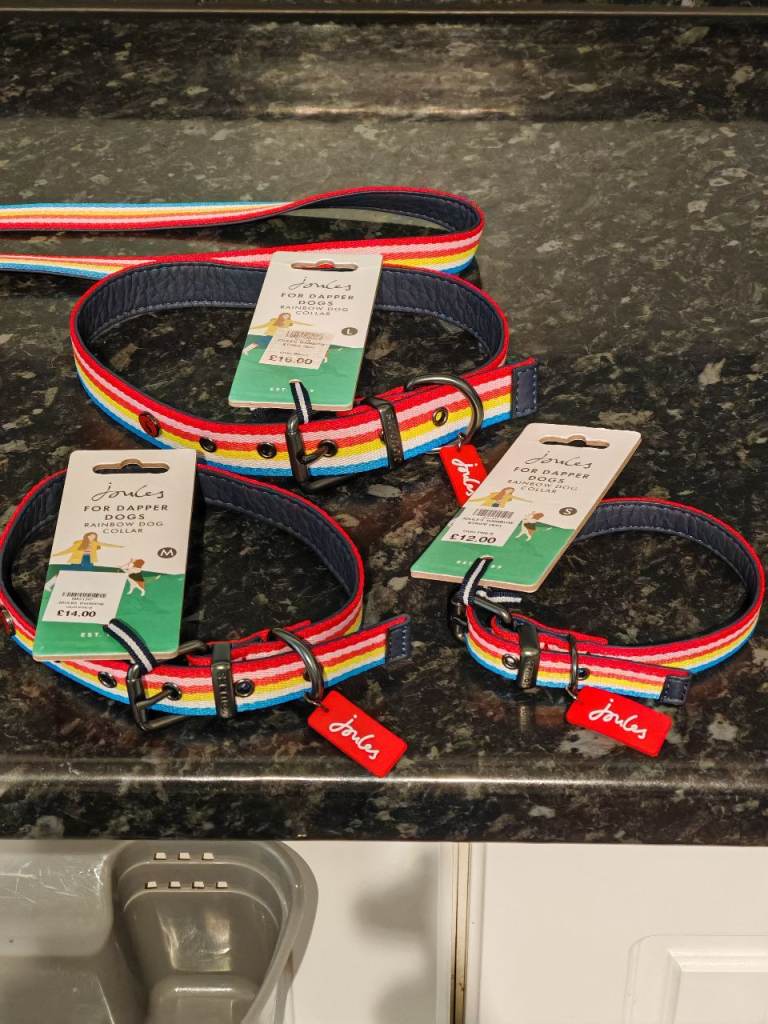 Joules rainbow dog harness size large, joules rainbow lead, 3 joules rainbow collars sizes large, medium and small, and a red extension lead, all items are brand new £30 the lot.