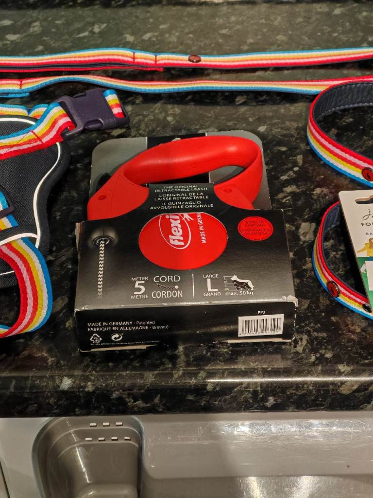 Posting for 12+ yearsJoules rainbow dog harness, lead, 3 collars and Flexi lead all brand new