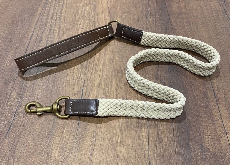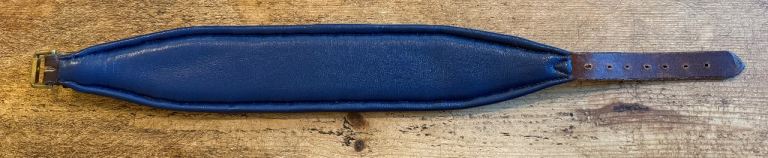 The collar is made from leather in Australian Nut colour, with navy blue leather padded inner. All metal fittings are solid brass.