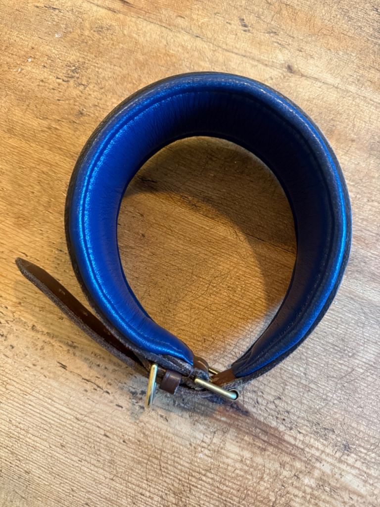 Lovely custom made leather dog collar suitable for sighthounds. I had this made at Three Shires Saddlery, but made a total mess of the sizing!