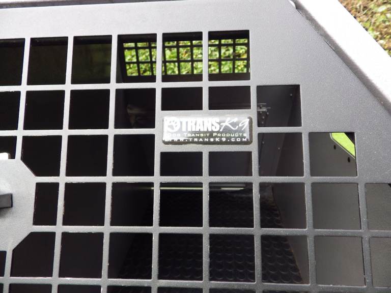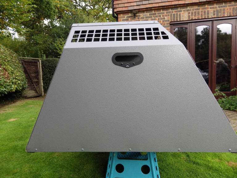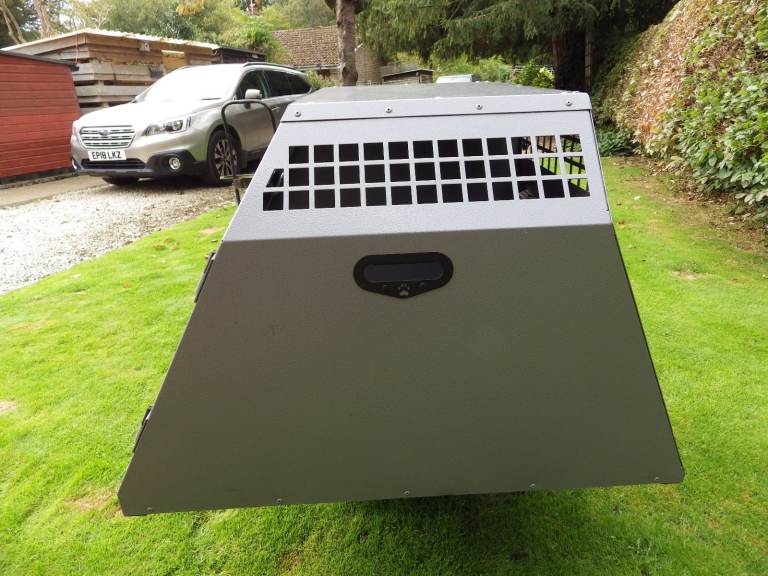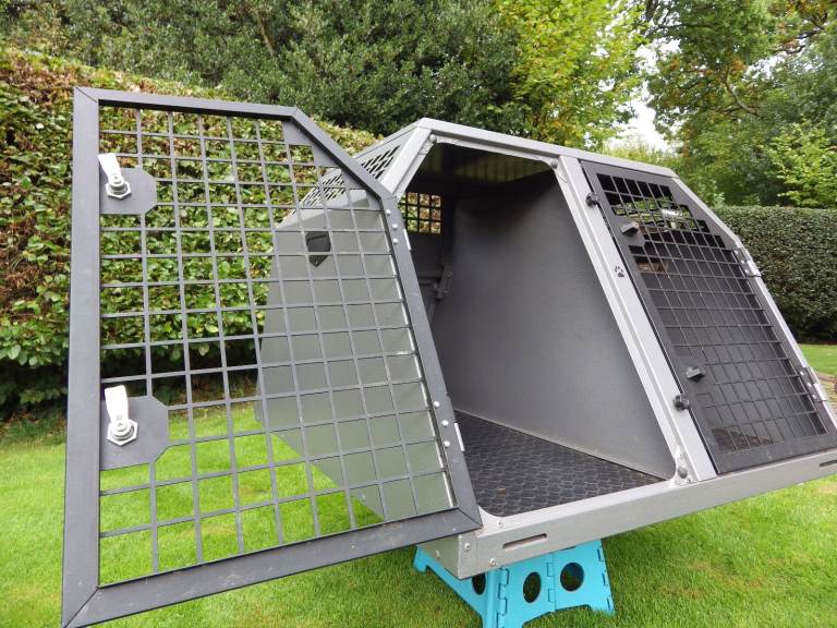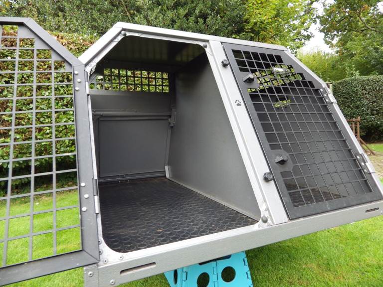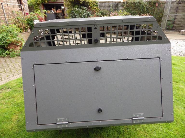 Used dog cage in first class condition; 39" wide x 40" deep x 26.75" high, with removable central solid divider, key locking door handles, rear escape door, internal-slip matting, anti-microbial powder coated finish. Suitable for Labrador Retriever or similar sized dogs.