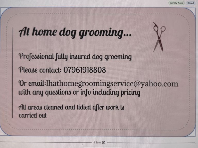 Professional Dog grooming level 3 diploma certified. Fully insured. *only grooming small/medium dogs at present* larger dogs for bath/nails/ear clean only.
