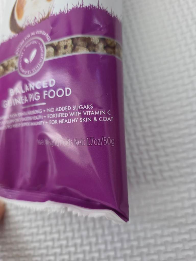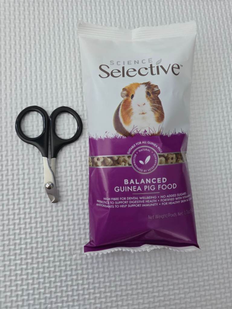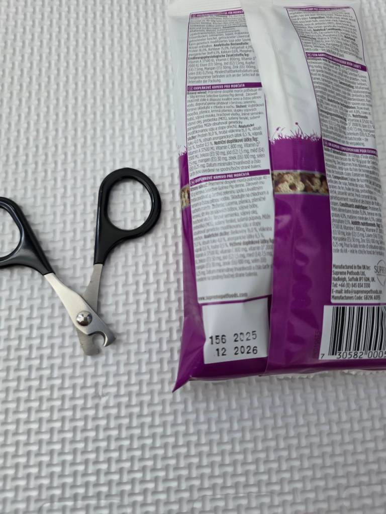This bundle also includes scissors to trim their nails and small (50g) of guinea pig food, best before December 2026, so it has still 1 year to go.