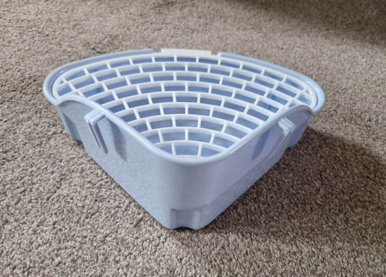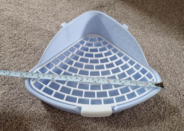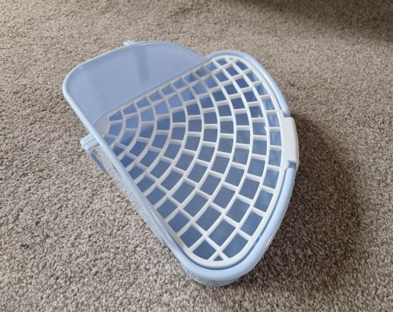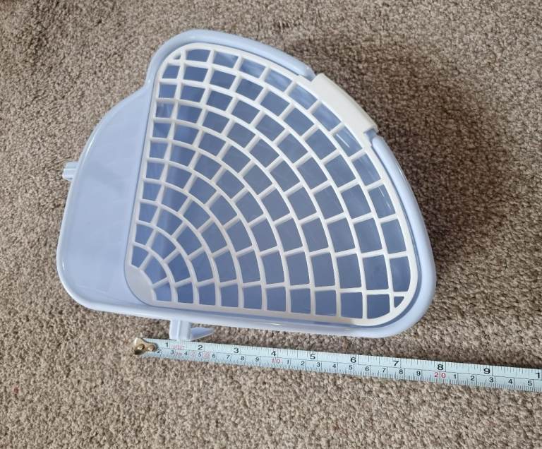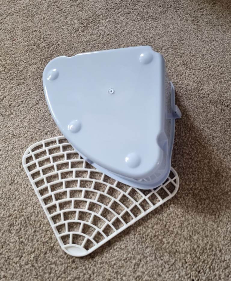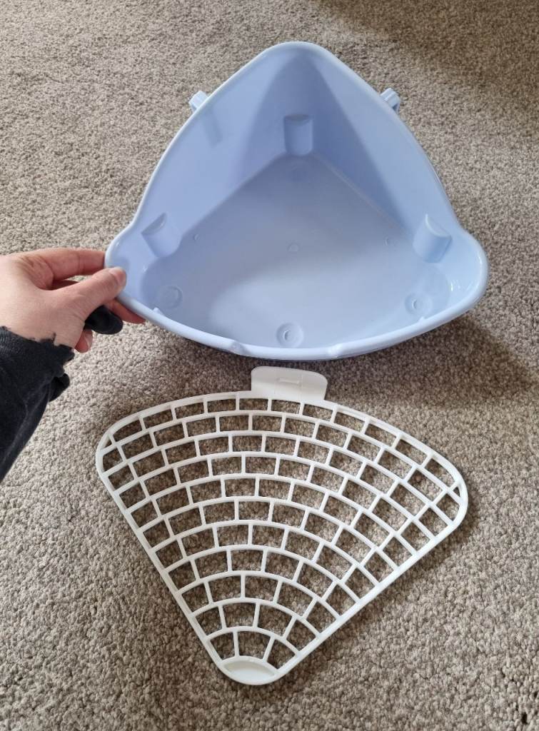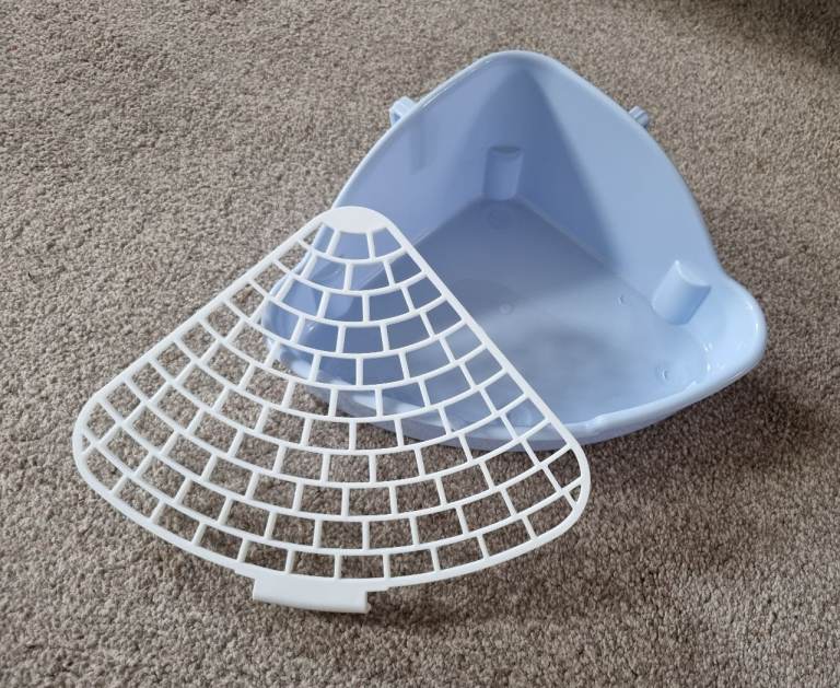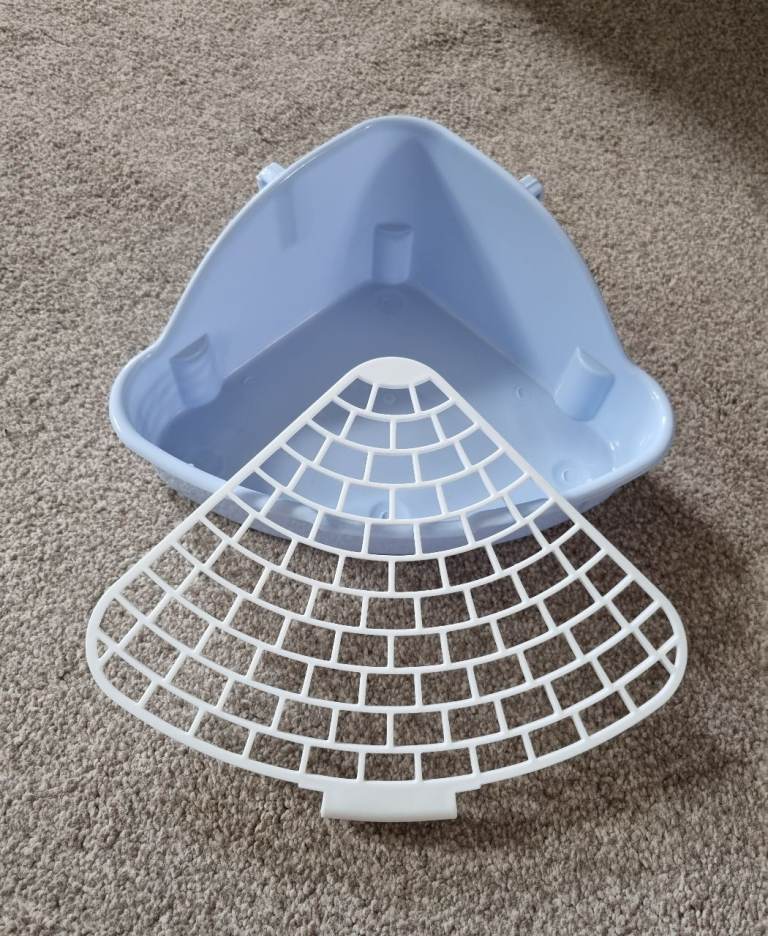 Completely new, clean, never used small corner litter tray with mesh to separate poop and pee and keep paws clean. Mesh is detachable for easy cleaning.
