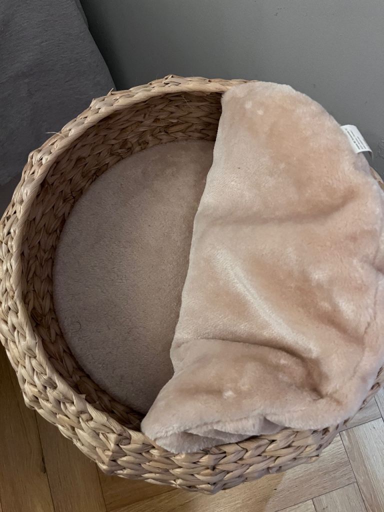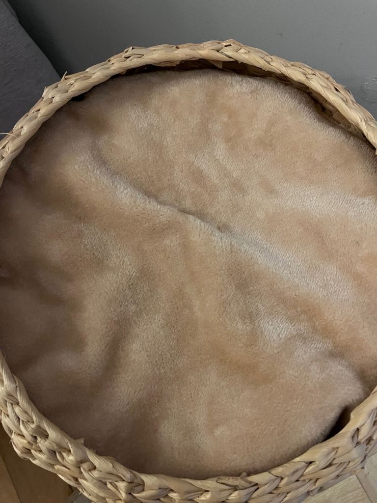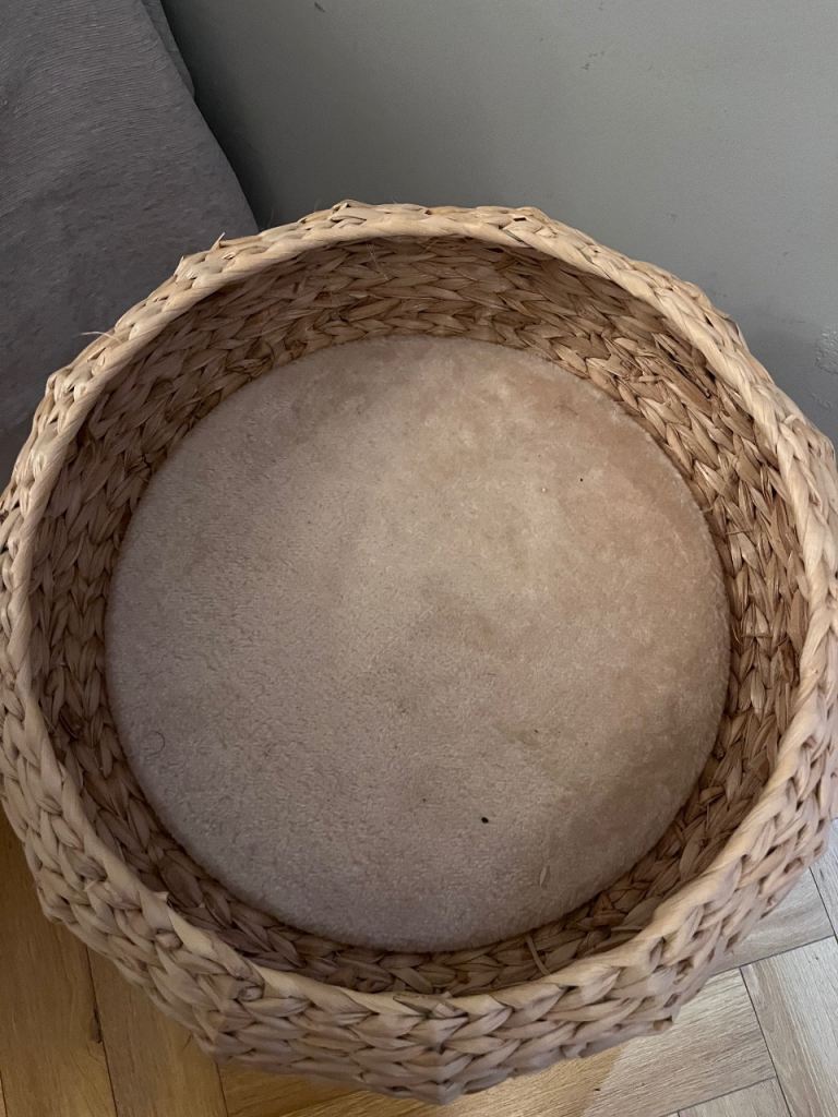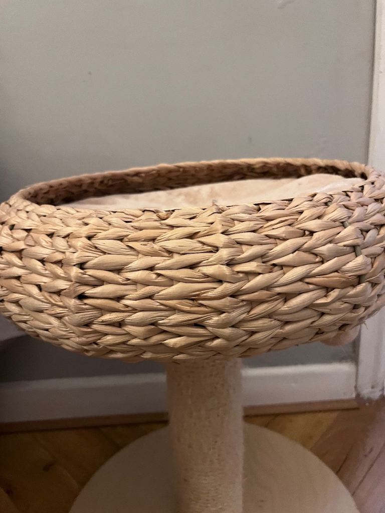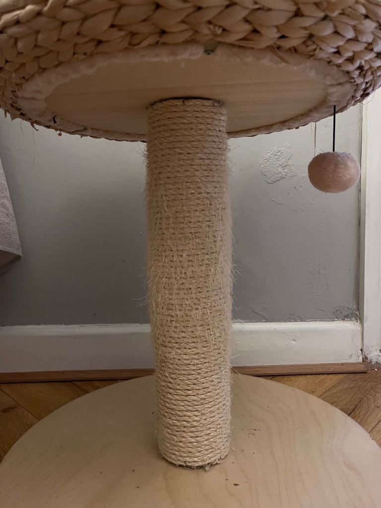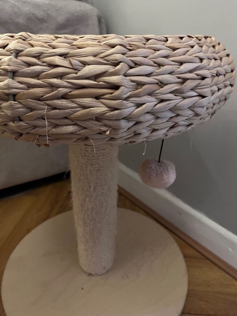Good condition but used cat bed and scratching pole with hanging toy ball.