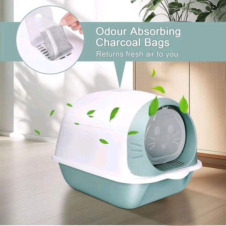 The enclosed cat litter box with baffle not only reduces litter spillage, but also blocks the cat's excrement and odour from spilling out. The package comes with a wood charcoal pack that can be placed in the groove on the top to better absorb and filter odours.