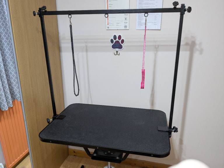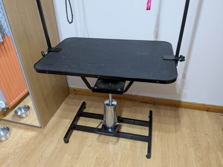Dog grooming table for sale. Hydraulic, and table also swivels. Can be sold either with or without the H-bar (without £45). Works perfectly, no rips or tears. Dimensions: 90cm(l)x60cm(w). Low of 70cm, high of 85cm.