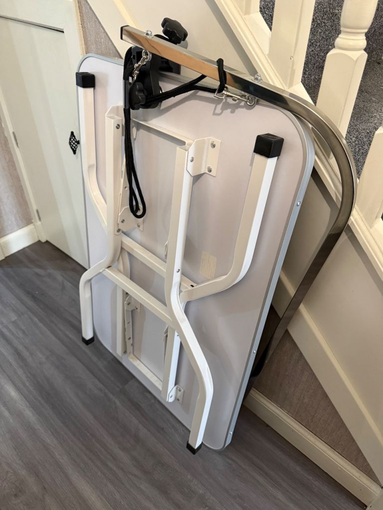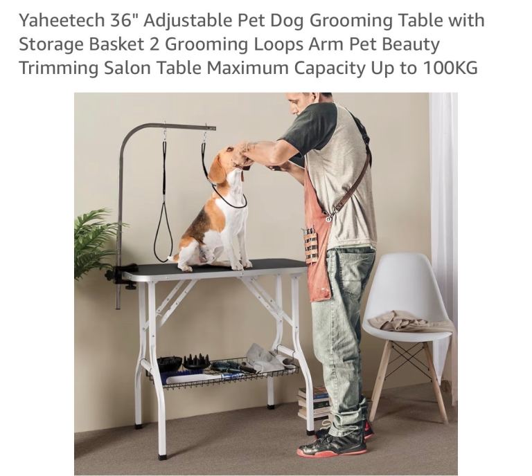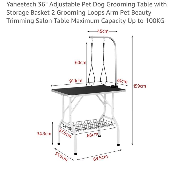 Very sturdy table with non slip surface and adjustable ties. Used about a dozen times. Ideal for home grooming as folds up.