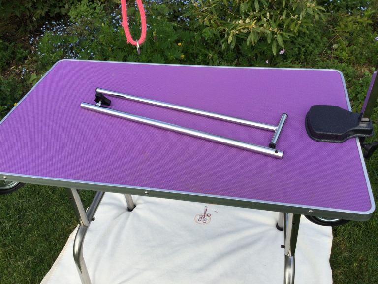 Pedigroom portable foldable grooming table with wheels in great used condition. Ideal for Crufts and other shows, home or salon grooming. Comes with Kebukai CleverGroom noose handmade in England.