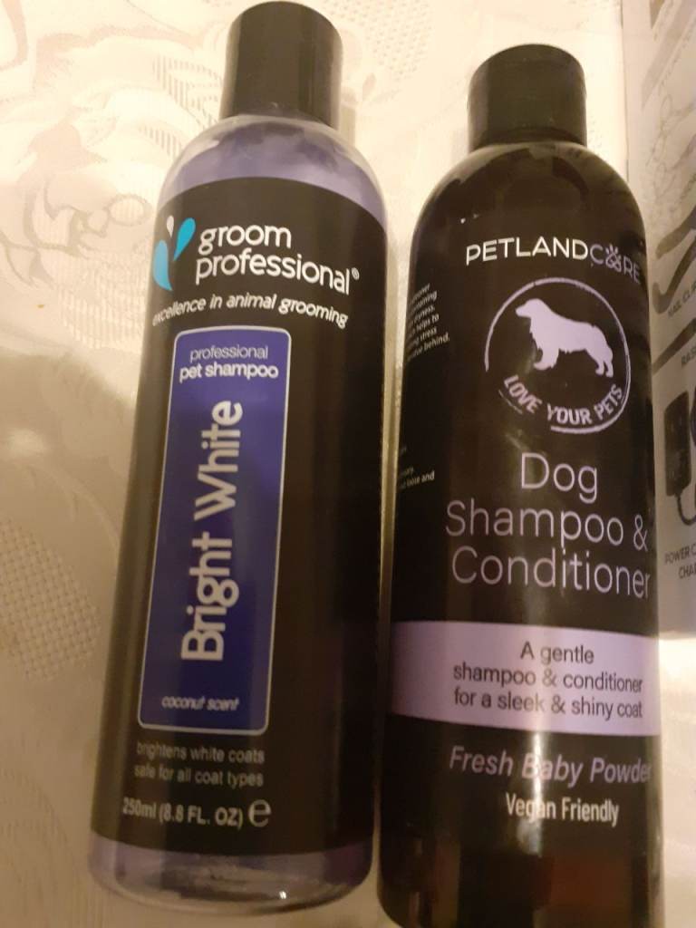 Attachments + shampoo also coat and hooks for hanging dog up whilst trimming