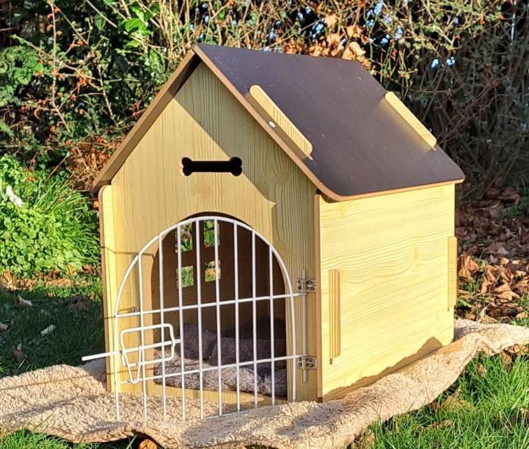 Wooden pet house for indoor use, no screws or fixtures required, simply slots together in seconds. Ideal for caravans, travel or sleepovers! Perfect condition, unused. Bedding included.