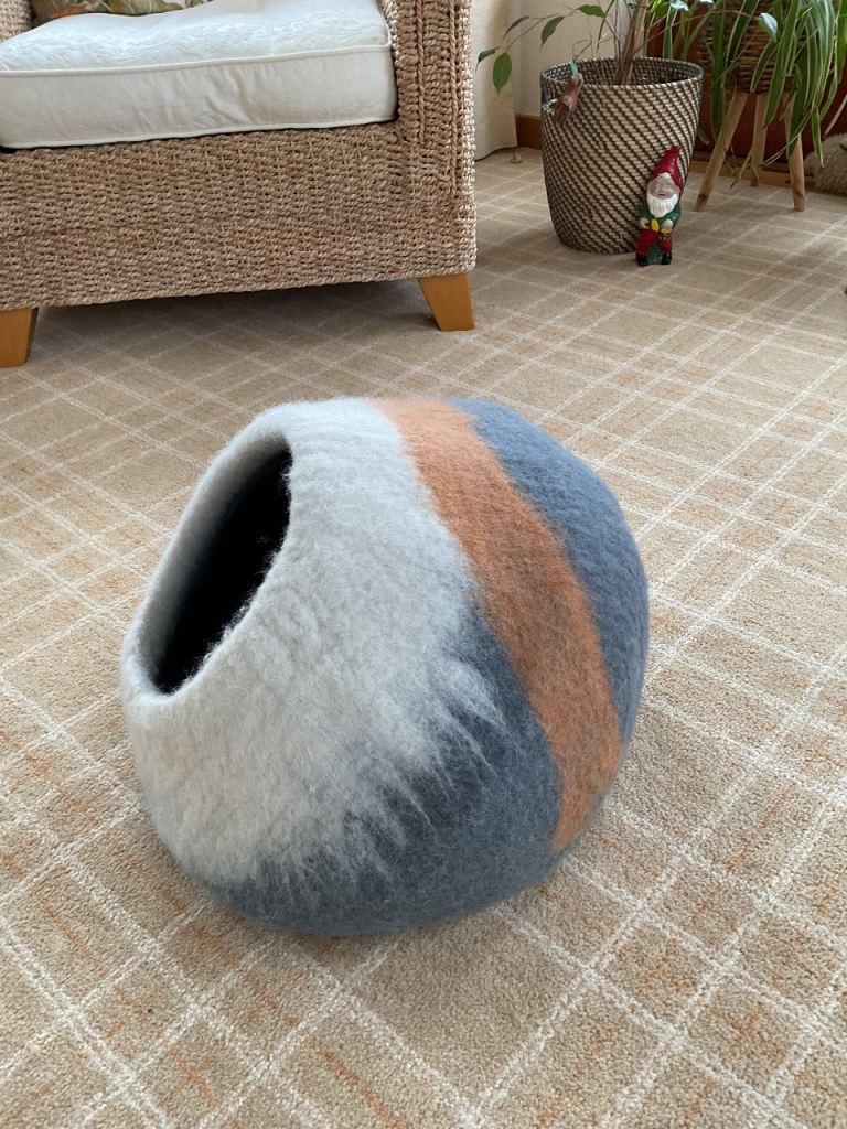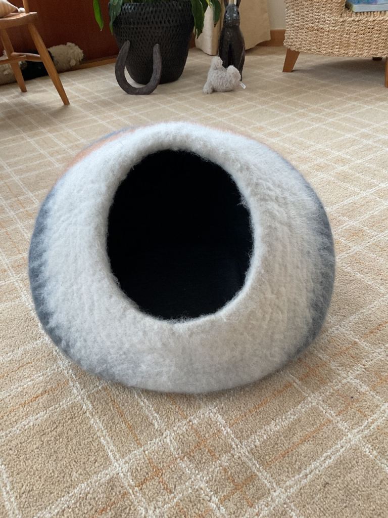 Beautifully made sturdy felt cat cave which our silver tabby would not go near. Can be used as a cave or flattened bed, soft comfortable and warm.