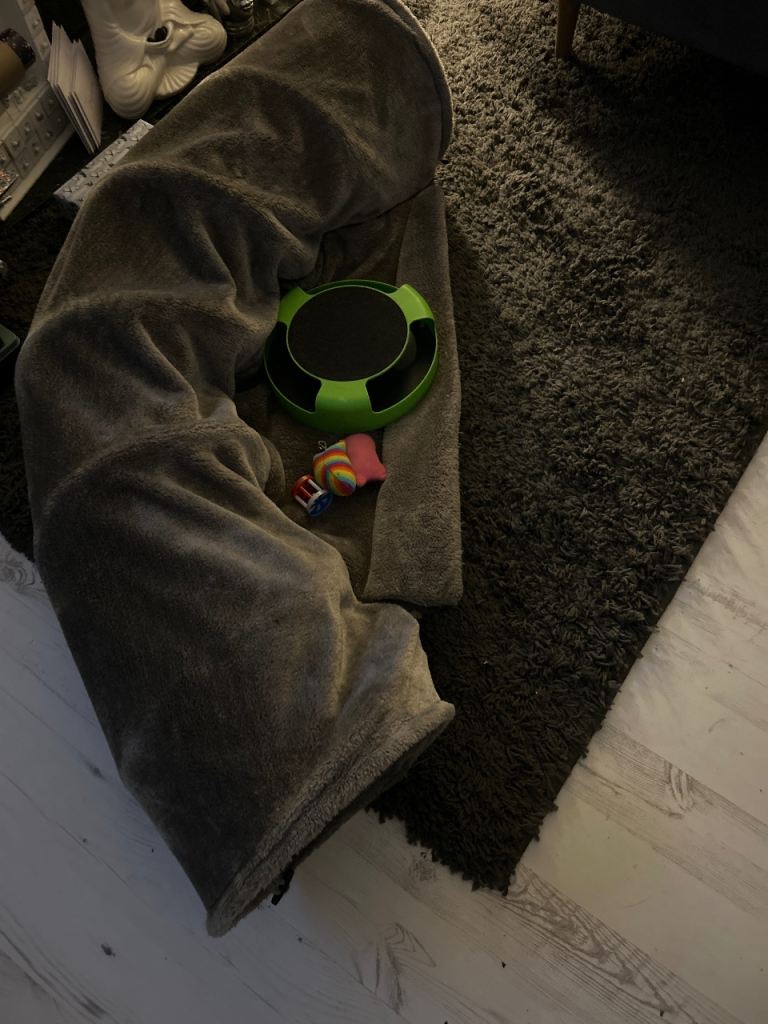 A large grey tunnel a chase the mouse toy and a few others my cat doesn’t play with them anymore