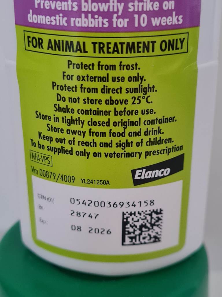Protects rabbits from flystrike for 10 weeks and should be used from spring to autumn.