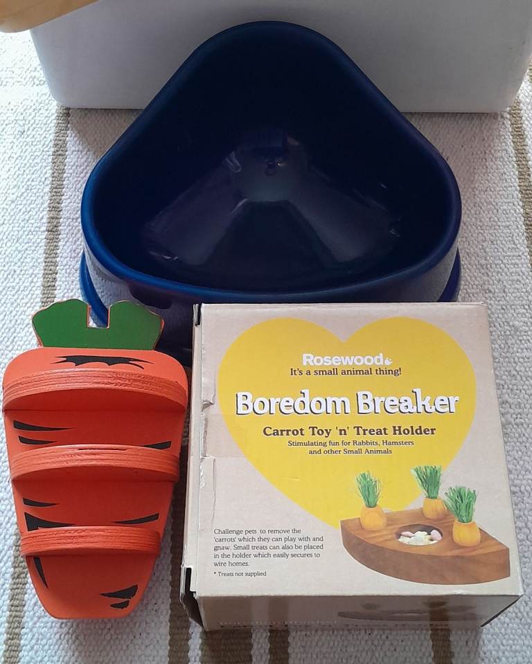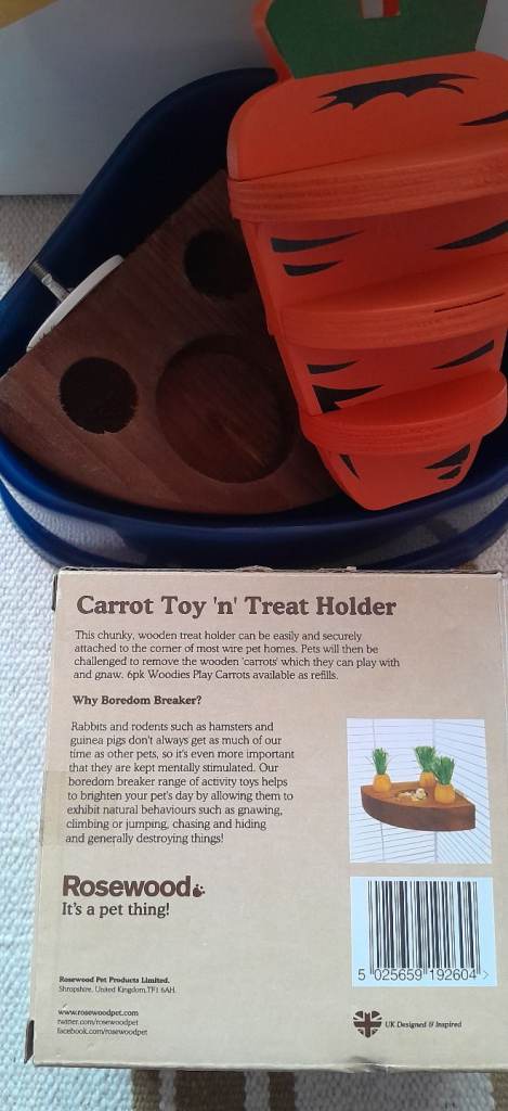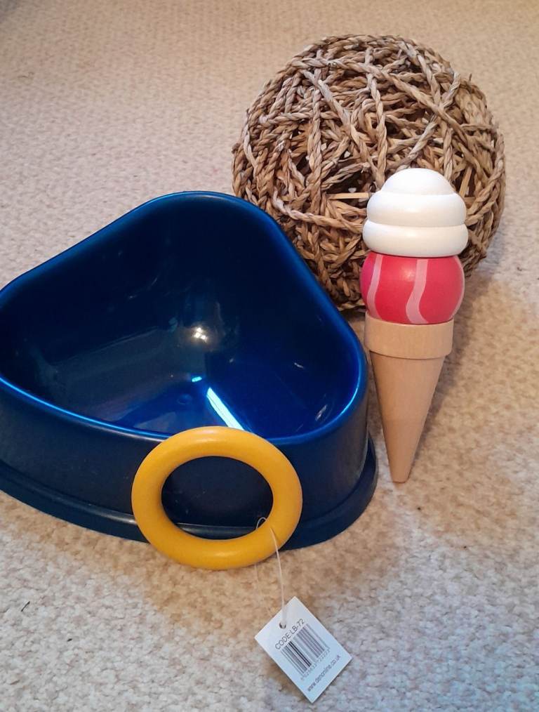 This is a bundle of small animal toys unused; Woven ball, wooden hoop, wooden ice-cream, Wooden carrot, foraging tray, 🔹️(please note the wooden carrots shown on the box are not included), two hanging flower baskets, play tunnel, and two new litter trays.