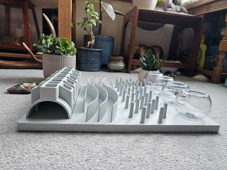 The Tongue Module: Here your cat must demonstrate skill with its tongue to get to the treats or water. The Tongue Module will also give a thrill to blind or otherwise disabled cats.