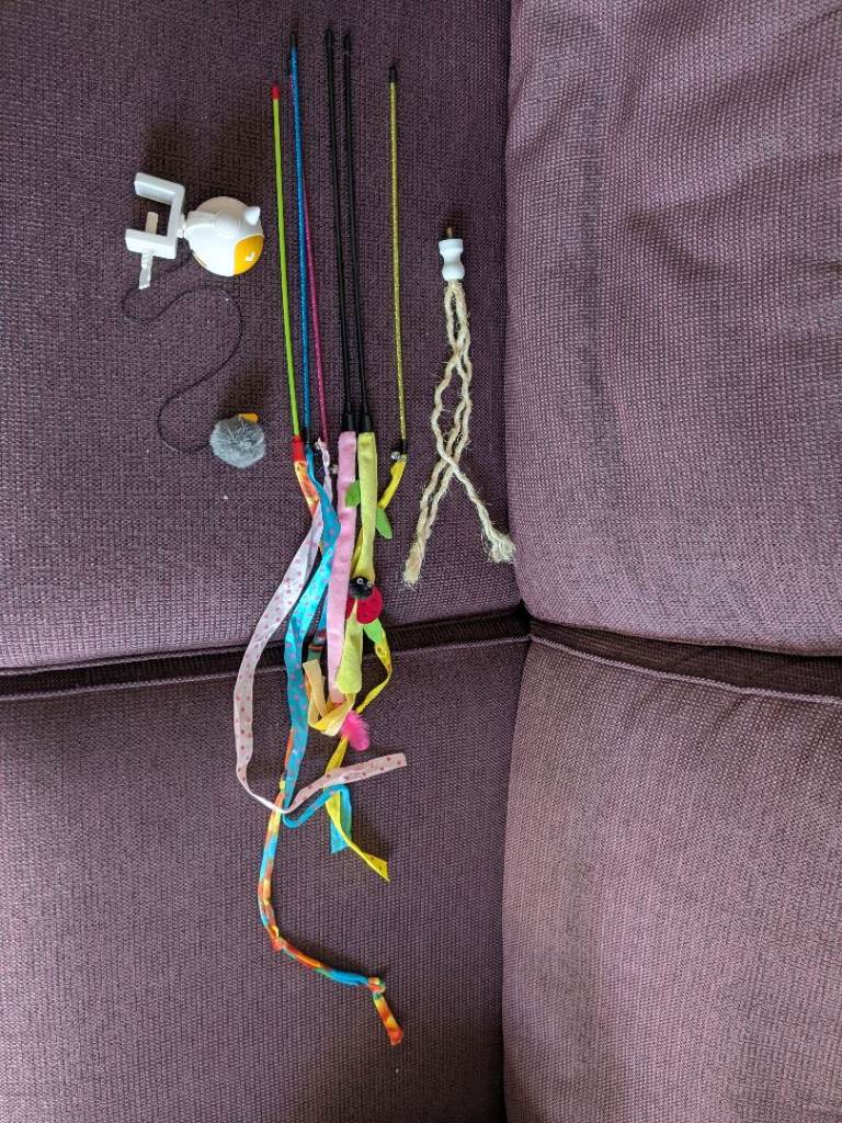 The biggest has three posts and a ball at the top (which has a rattle inside). The other is a single post signed to lay flat on the ground. Happy to throw in a selection of stick toys (also completely uninteresting to our cat!) and a battery powered string toy.