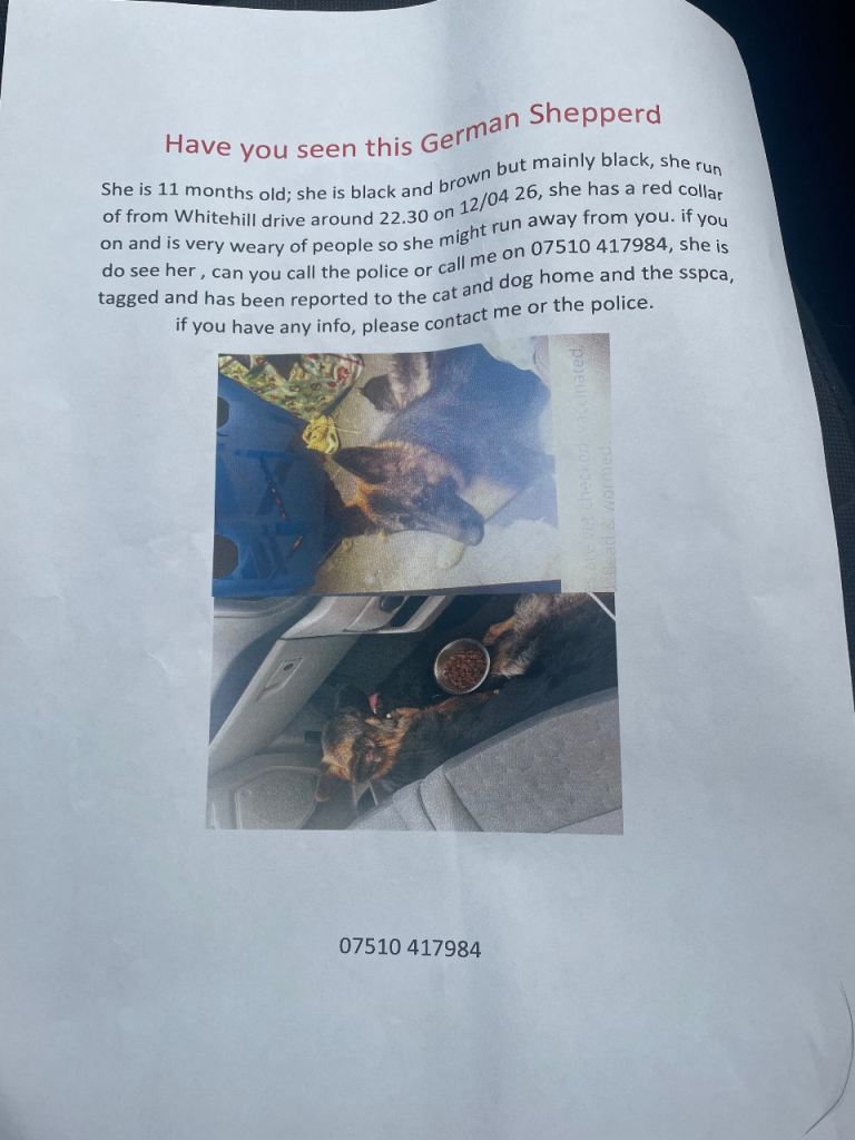Her name is Margret, she is a black and brown German Shepperd, she is 11 months old and is very scared of people she does not know, she run off last night about 23.30 from Whitehill drive in Woodburn, Dalkeith, the police have been informed, if you see her Please call the police or email me, Thank you