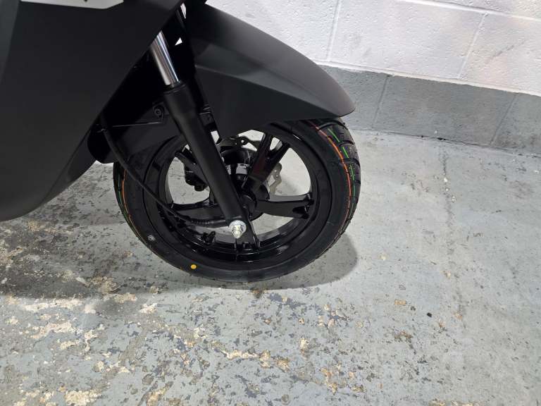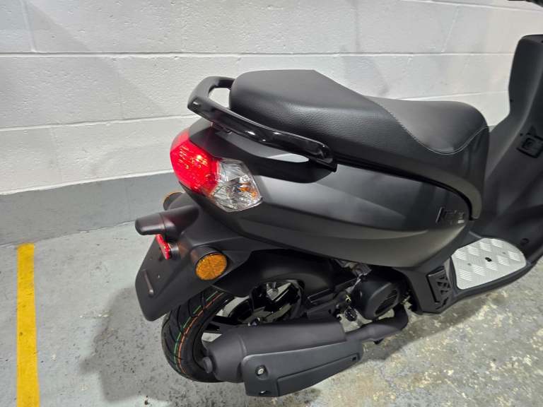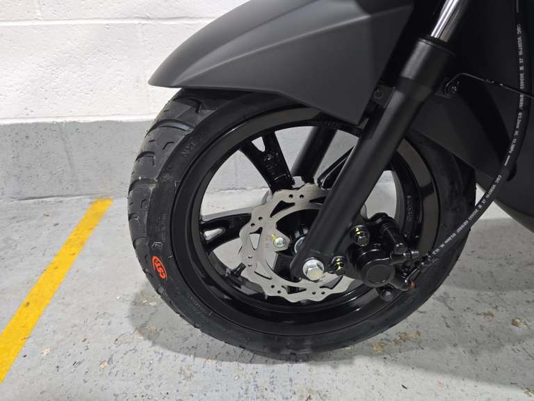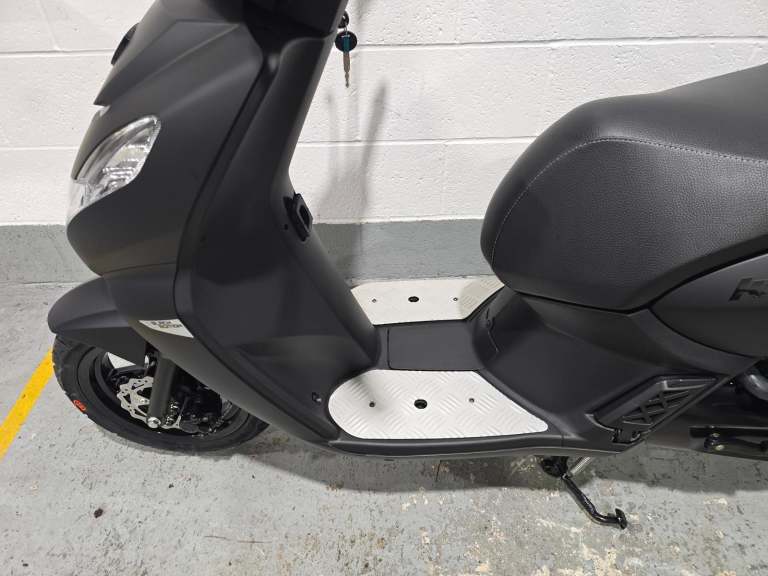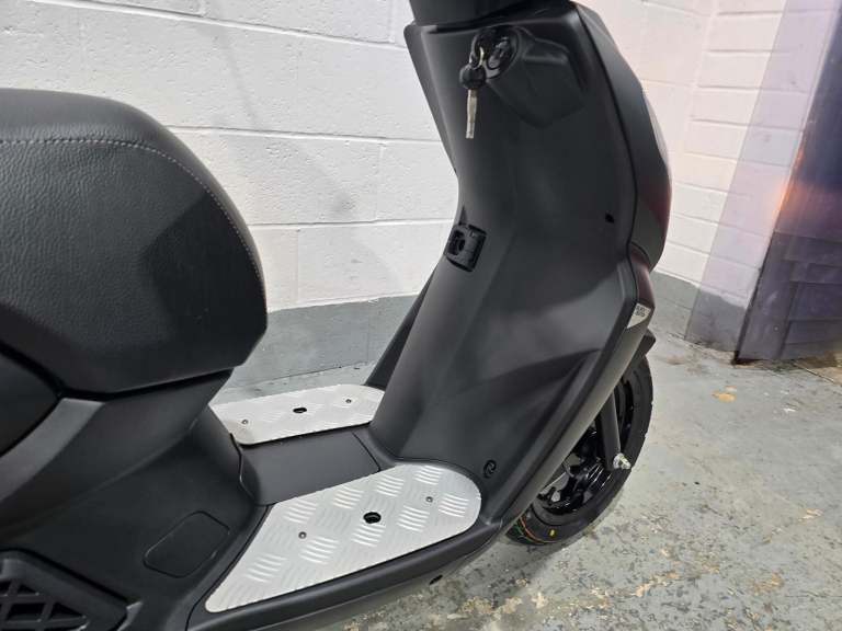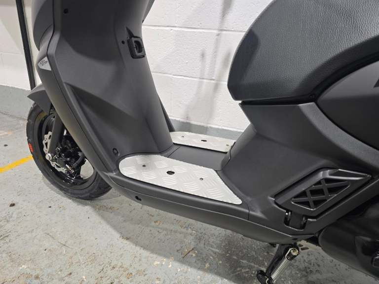 Comfortable and secure. The practical details of this 50cc scooter have been designed for the convenience of the rider and passenger: two-seater saddle, retractable passenger footrest plates, 170 mm disc brake at the front, flat floor, low seat at 760 mm and 12“ wheels.