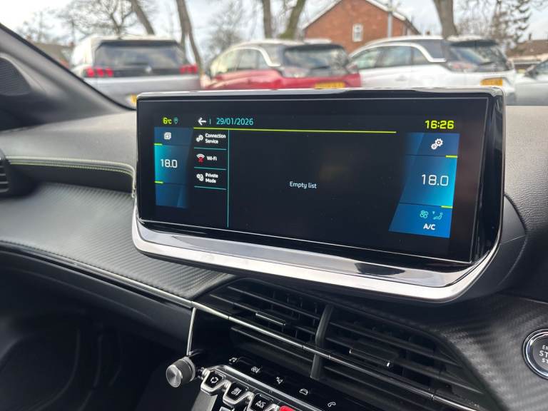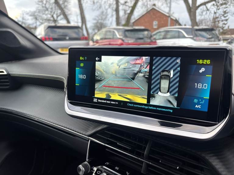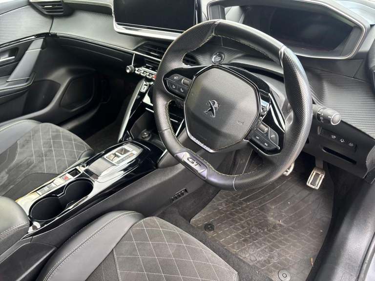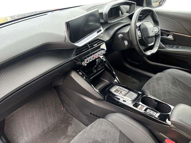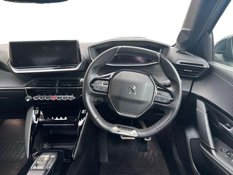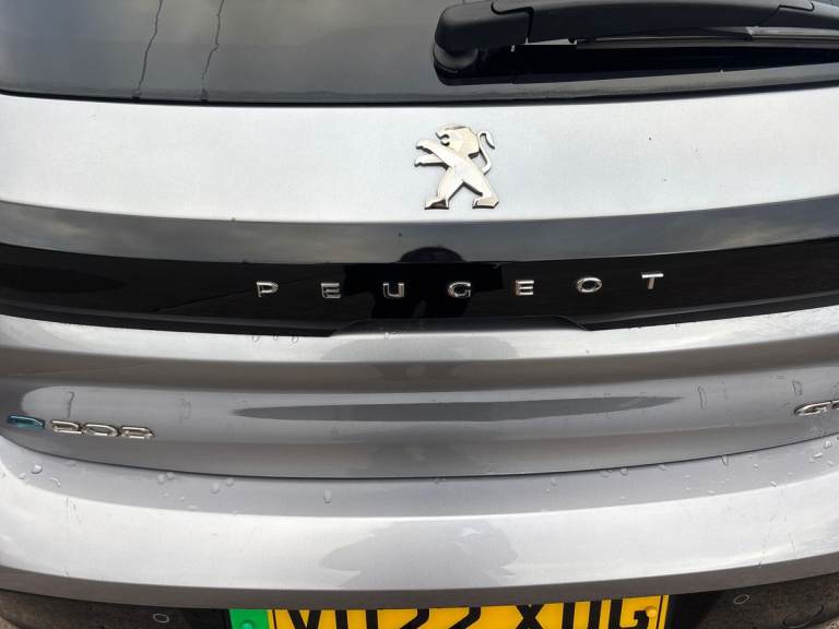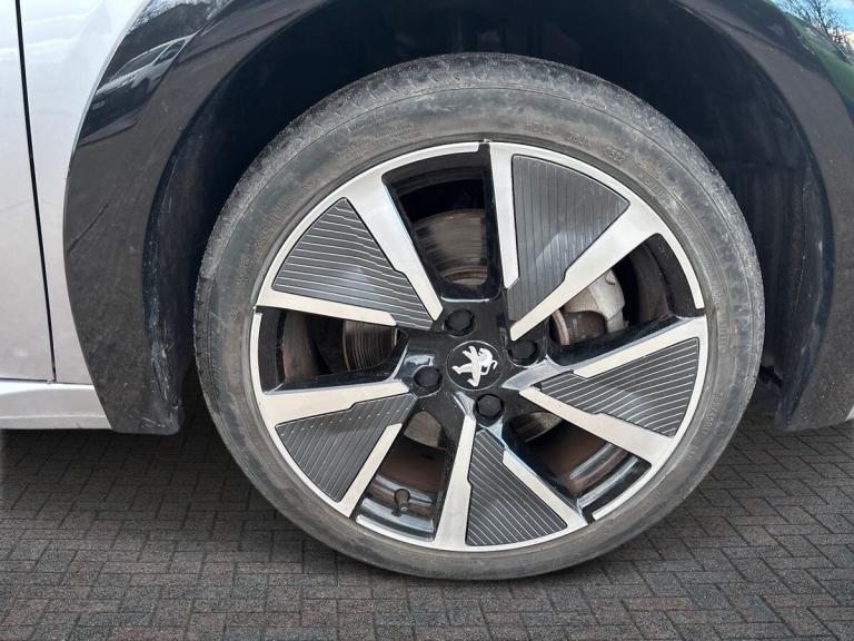 ..10'' Capacitive colour touchscreen with connected 3D navigation, Blind spot monitoring, Bluetooth telephone facility, Driver attention warning, e-Toggle driving selector, Exterior temperature indicator with ice warning, Mirror screen with mirror link, apple carplay and android auto, Multi function trip computer, PEUGEOT i-Cockpit with compact steering wheel, PEUGEOT i-Cockpit with configurable 3D headup instrument panel, PEUGEOT SOS and assistance, Push button start, Smart phone docking station, Speed limit recognition and recommendation, Visio park assist 180 with colour reversing camera + front and rear parking sensor, 7 kW monophase on board charger, Mode 3 type 2 cable for wallbox charging, 2 front USB socket with USB-C, 2x USB sockets in rear, 6 speakers radio with mp3 compatible, DAB Digital radio, Voice recognition for radio, navigation and telephony features, 2 X Rear number plate lights, Automatic hazard light activation upon heavy brake application, Automatic lights, Automatic windscreen wipers, Body coloured exterior door handles, Dark tinted rear side and tailgate windows, Diamond black rear spoiler (roof), Diamond Black roof, Dichroic badging in front lion with e monogram on C pillar and tailgate, Electric front windows + one touch + anti-pinch, Electric rear windows with one touch/anti-pinch, Electrically adjustable, heated and power folding door mirrors, Follow me home headlights, Frameless electrochrome interior rear view mirror, Full LED headlights with smartbeam assist, Gloss black finish on B pillar, Gloss black rear cluster connecting strip, Gloss black wheel arch extensions, Gloss black window surround, GT model designation badging on tailgate, Headlights left on audible warning, LED daytime running lights with 3 claw headlight with distinctive tooth design, LED side indicator lights integrated into door mirrors, LED third brake light, Model designation badges front and rear, Nera black door mirror shells, Peugeot scuff plates, Radiator grille - body colour chequered and gloss black edge trim, Rear bumper with gloss black finish, Rear full LED 3D peugeot signature claw effect lights with daylight function, Rear lower bumper diffuser effect trim in gloss black, Rear reversing lights, Rear side wing doors, Rear windscreen wiper triggered automatically in reverse gear, Roof mounted aerial with fin design, Roof spoiler, Tailgate with heated rear windscreen and wiper blade, Variable front intermittent wipers, 1/3 to 2/3 split folding