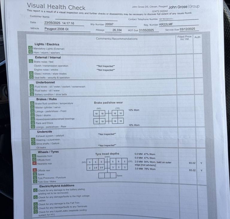 This 2022 Peugeot E-2008 GT is a clear vehicle history example, offering a compelling electric driving experience. As an electric vehicle, it boasts a 50 kWh battery with a maximum range of 214 miles when new. Charging is convenient, with a full charge at home using a 7kW charger taking approximately 7 hours and 30 minutes, and rapid charging to 80% from empty achievable in just 30 minutes at a public station. This GT trim level comes equipped with a suite of advanced features, including a Blind Spot Monitoring System with Blind Spot Assistance, front and rear parking sensors for effortless manoeuvring, and the innovative PEUGEOT 3D i-Cockpit with a configurable 3D head up instrument panel. Youll also find a convenient smartphone charging plate for wireless charging and a Visio Park 1 180 degree colour reversing camera to aid parking. The Peugeot E-2008 GT stands out with its combination of electric efficiency and sophisticated technology. The inclusion of the PEUGEOT 3D i-Cockpit provides a modern and intuitive driving interface, while the comprehensive parking assistance systems, including front and rear sensors and a 180 degree reversing camera, make navigating tight spaces significantly easier. The Blind Spot Monitoring System adds an extra layer of safety, alerting you to vehicles in your blind spots. These features, alongside the impressive electric range and rapid charging capabilities, position this E-2008 GT as a superior choice for those seeking a stylish, practical, and technologically advanced electric car..1-3 - 2-3 Folding Rear Seat, 12V Power Socket, 17in Alloy Wheels - Salamanca - Diamond Cut, 6-Speaker Radio - MP3 Compatible, 7KW Monophase On Board Charger, 8-Colour Customisable Ambient Lighting, ABS with Electronic Brake Force Distributor EBD and Emergency Brake Assist EBA, AVAS - Acoustic Vehicle Alerting System, Active Safety Brake - Night Function - Cyclists - Pedestrians, Alarm with Anti-Lift Sensor, Aluminium Pedals, Automatic Air Conditioning with Pollen Filter and Carbon Active Filter, Automatic Door Locking When Moving Off, Automatic Front Windscreen Wipers, Automatic Hazard Light Activation Upon Heavy Brake Application, Blind Spot Monitoring System, Bluetooth Telephone Facility, Child Locking Functionality on Rear Doors, DAB Digital Radio, Dark Tinted Rear Side and Tailgate Windows, Dashboard - Front and Rear Door Panel Finish - Carbon Effect, Deadlocking, Door Mirror Shells - Diamond Black, Driver Attention Alert, Driver and Front Passenger Seat Mechanical Height Adjustment, Driver and Front Passenger Side Airbags, Driver and Front Passenger Sport Seats, Driver and Passenger Airbag with Passenger Airbag Deactivation Switch, ESP - Electronic Stability Program - with Hill Assist, Electric - Heated and Power Folding Door Mirrors with Floor Lighting, Electric Parking Brake, Electric Power Steering with Reach and Rake Adjustable Steering Column, Electric Windows - Front and Rear with One Touch, Electronic Code Immobiliser, Exterior Door Handles - Body-Colour, Exterior Temperature Indicator with Ice Warning, Frameless Electrochrome Rear View Mirror, Front Central Armrest with Storage Compartment, Front Optimised Safety Headrests and Rear Retractable Headrests - x3 - Height-Adjustable, Front USB Socket x2 including x1 USB-C, Front Wing Trim - Black with Gloss Black Detail and E Monogram, Front and Rear 3 Point Retractable Seatbelts - With Force Limiter, Front and Rear Carpet Mats in Black with Specific Detailing, Front and Rear Curtain Airbags, Front and Rear Parking Sensors, Full LED Headlights with Smartbeam Assist, GT Model Designation Badging on Tailgate, Gloss Black B Pillar, Gloss Black Rear Cluster Connecting Strip, Gloss Black Window Surround, Headlights Left On Audible Warning, High Centre Console, ISOFIX Child Seat Fittings - x2 in the Outer Rear Seat, ISOFIX Location Points - Front Passenger, LED Daytime Running Lights - 3-Claw Headlight with Distinctive Tooth Design, LED Front Fog Lights with Remote Cornering Function, LED Front Interior