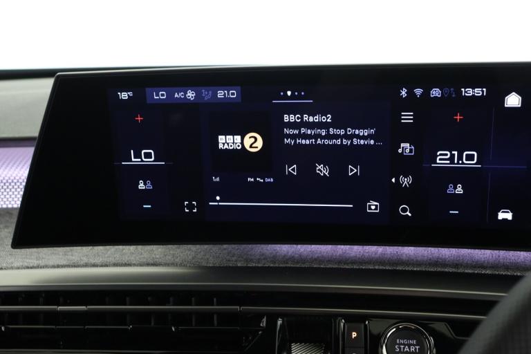 ..Adaptive cruise control with Stop and Go, Bluetooth with two microphones (Connect up to 2 phones), Drive modes select (Eco, normal and sport) with configurable ambient lighting, Driver foot rest, Driver profile selection, E-call, Exterior temperature indicator with ice warning, Front parking sensor, Front passenger seat detection, Hands free Smart Electric Tailgate (foot operated), Lane keep assist, Multi function trip computer, Natural voice recognition, PEUGEOT i-Cockpit - 21'' HD panoramic curved display incorporating instrument panel and touchscreen with 3colour themes, PEUGEOT i-connect advanced HD fully customisable touch screen, Navigation with Tom Tom Live updates and over the air map updates, PEUGEOT SOS and assistance, Rear parking sensor, Remote charge management via My PEUGEOT App, Speed limit and traffic sign recognition and recommendation, Wireless mirror screen with apple carplay and android auto, Wireless smartphone charger with status light and ambient lighting, 11 KW triphase On board charger, Dynamic stability control and electronic anti-skid system, Mode 3 type 2 cable for wallbox charging, Multi-link rear suspension, 2 USB-C ports in the front, AM/FM bi-tuner, DAB Radio (Digital Audio Broadcasting), Peugeot customisable virtual iToggles, 3008 model designation badgers front and rear in basalt grey, Acoustic windscreen, Automatic hazard light activation upon heavy brake application, Automatic headlamp activation, Automatic windscreen wiper activation with interval wiping intensity control, Black diamond roof and floating effect rear spoiler finished in nera black metallic, Body coloured exterior door handles, Dark tinted privacy glass for rear door, Tailgate and Quarter windows, Door mirrors - Welcome lighting and integrated LED indicators, Electric adjustable/heated/folding door mirrors, Flat blade wipers with magic wash integrated nozzles, Frameless electrochrome rear view mirror, Front and rear electric windows with one touch, Front grille with body coloured accents, Gloss black connecting strip between rear lights, Gloss black finish B pillar, Heated rear window, Laminated windscreen, LED daytime running lights, LED exterior lighting, LED third brake light, Lower front and rear bumper trims in meteor grey, Orbital gloss black door mirrors, Orbital gloss black lower door claddings and widened wheel arches, PEUGEOT shield on front wings, Pixel LED Technology headlights with adaptive high beam assist, Rain sensor, Rear full LED 3D