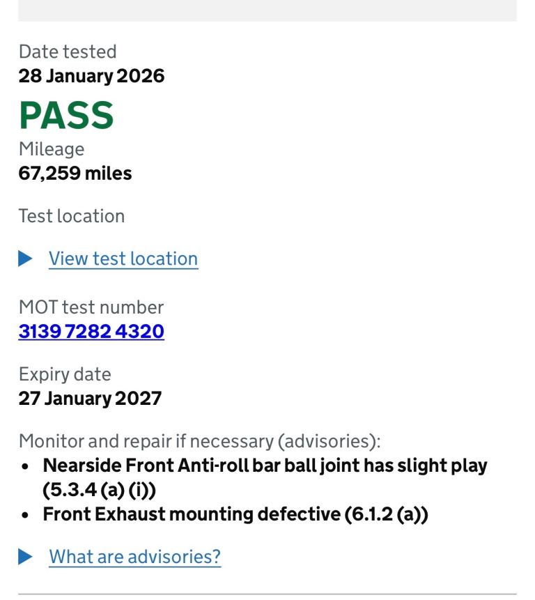 Passed MOT today (28.01.2026). Only advisories (non urgent) are anti roll bar link and exhaust mount. The same garage welded up the exhaust mount last year and it’s fine and passed MOT but they have to note it apparently