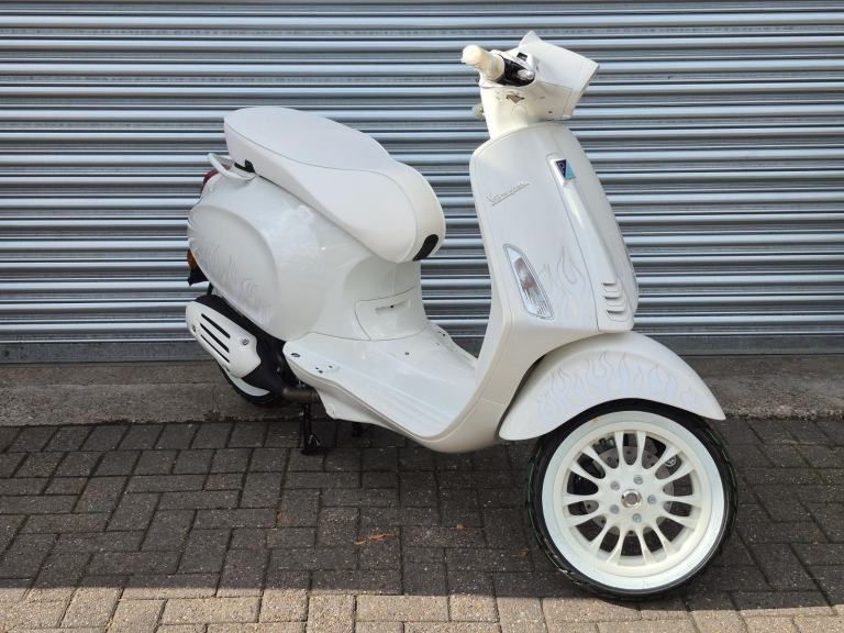 Vespa have teamed up pop sensation Justin Bieber to create a truly unique version of the excellent Sprint model. The effortlessly cool, white on white monochromatic colour theme is detailed with a subtle pearl flame design featuring the artists logo on the side panels and mudguard.