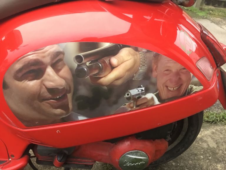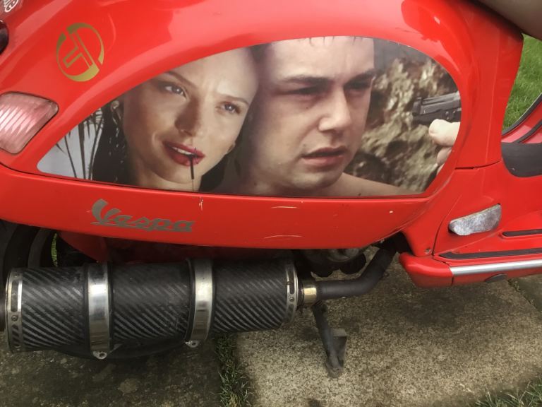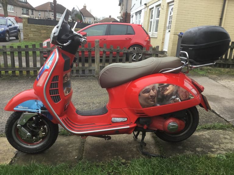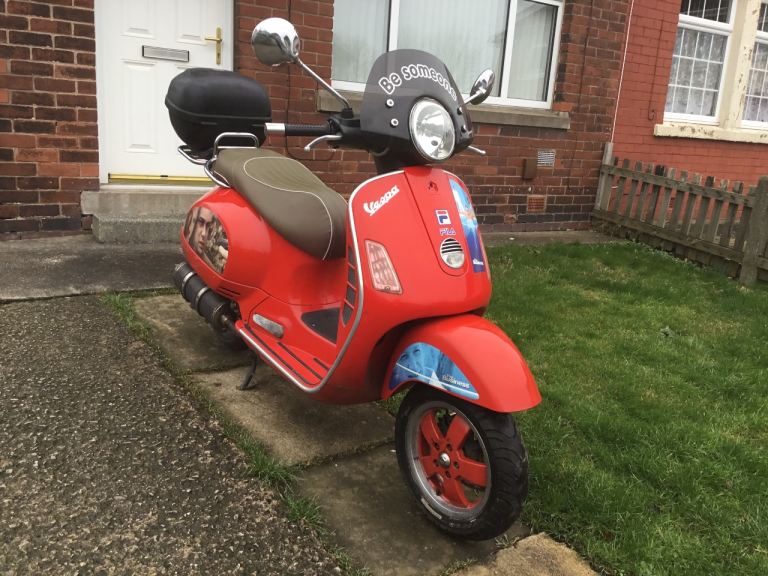 Vespa gts 250cc, fully automatic twist and go, factory immobiliser with the all important master key, carbon fibre sports exhaust, (sounds great) front windshield, rear carrier with removable luggage box plus under seat storage, new front and rear brake discs and pads just recently fitted, current mot until the 8th of July, the decals feature the business with Danny dyer as can be seen in the pictures, good runner and condition, £995, may deliver if required depending on the distance, call for more information or any enquiries.