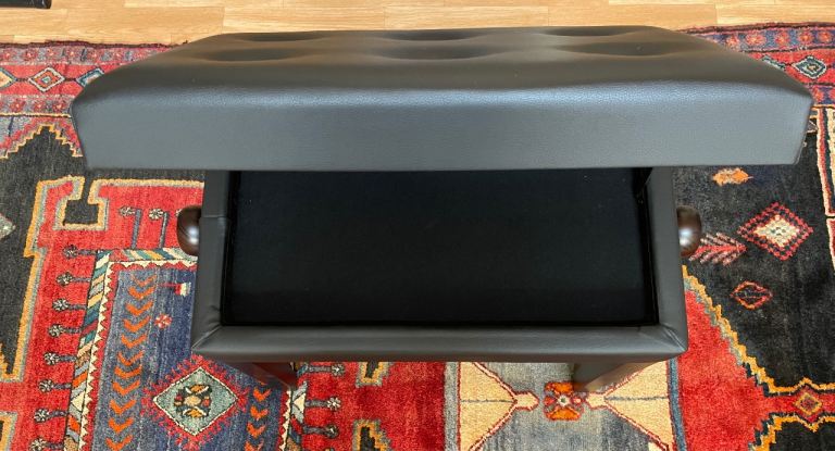 Fully adjustable padded piano stool, which is very comfortable and in excellent condition. Height adjusts using the rotary handles on either side. Storage inside for music books etc.