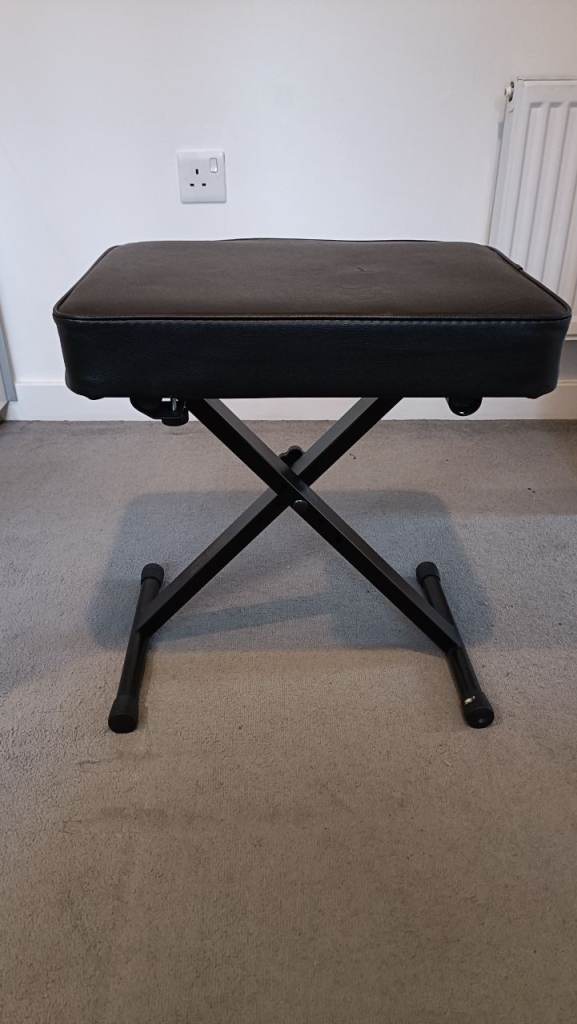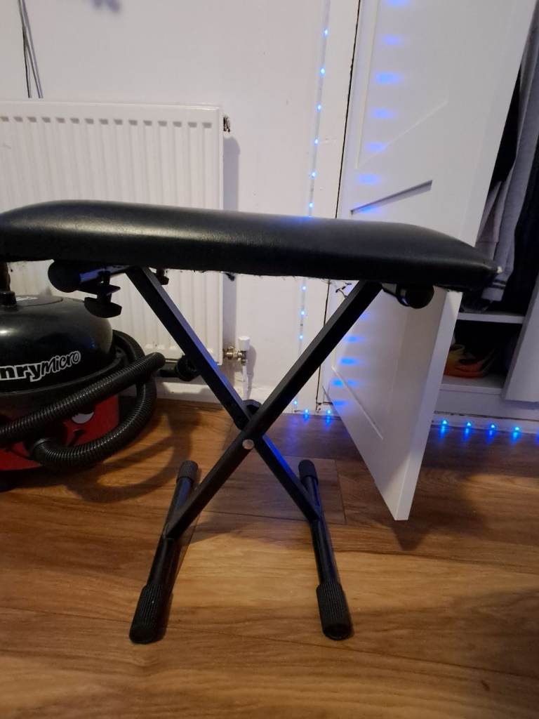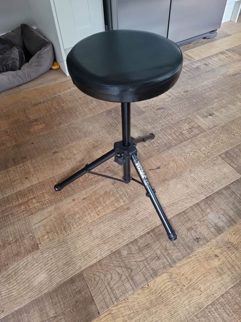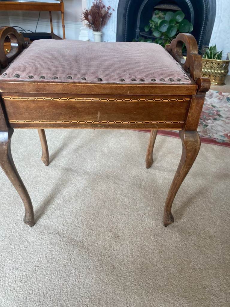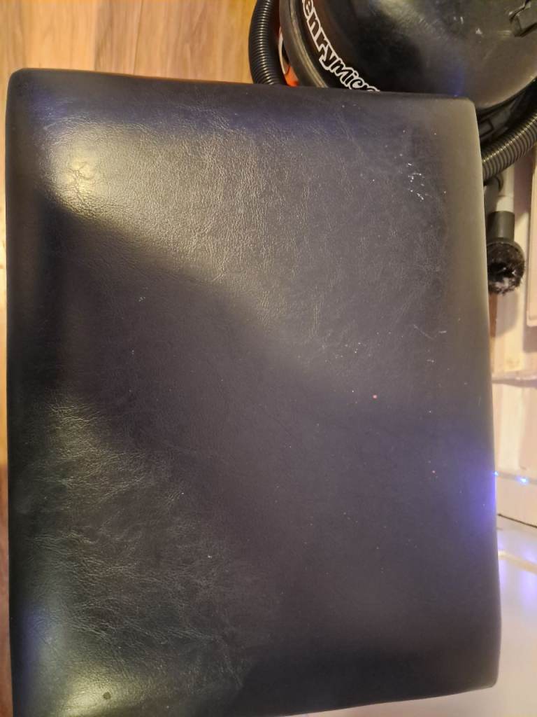 It has been owned for a couple years. Its around 18 inches tall, and the seat is 16 inches long at its longest side and then about 12 inches on the left and right in the pic. It is a bit uneven and can be wobbly when shifting, and this is the way it had come when i had gotten it. The height is adjustable. The seat itself is clearly worn down.