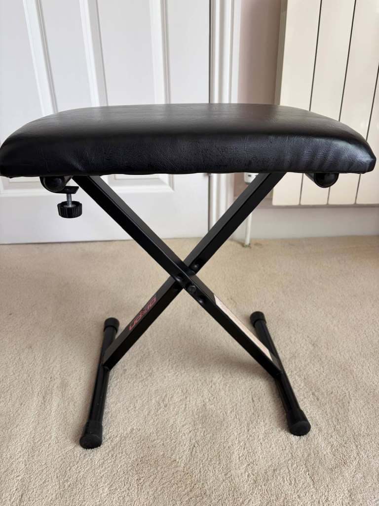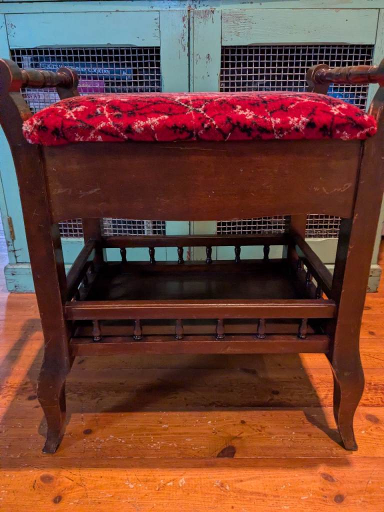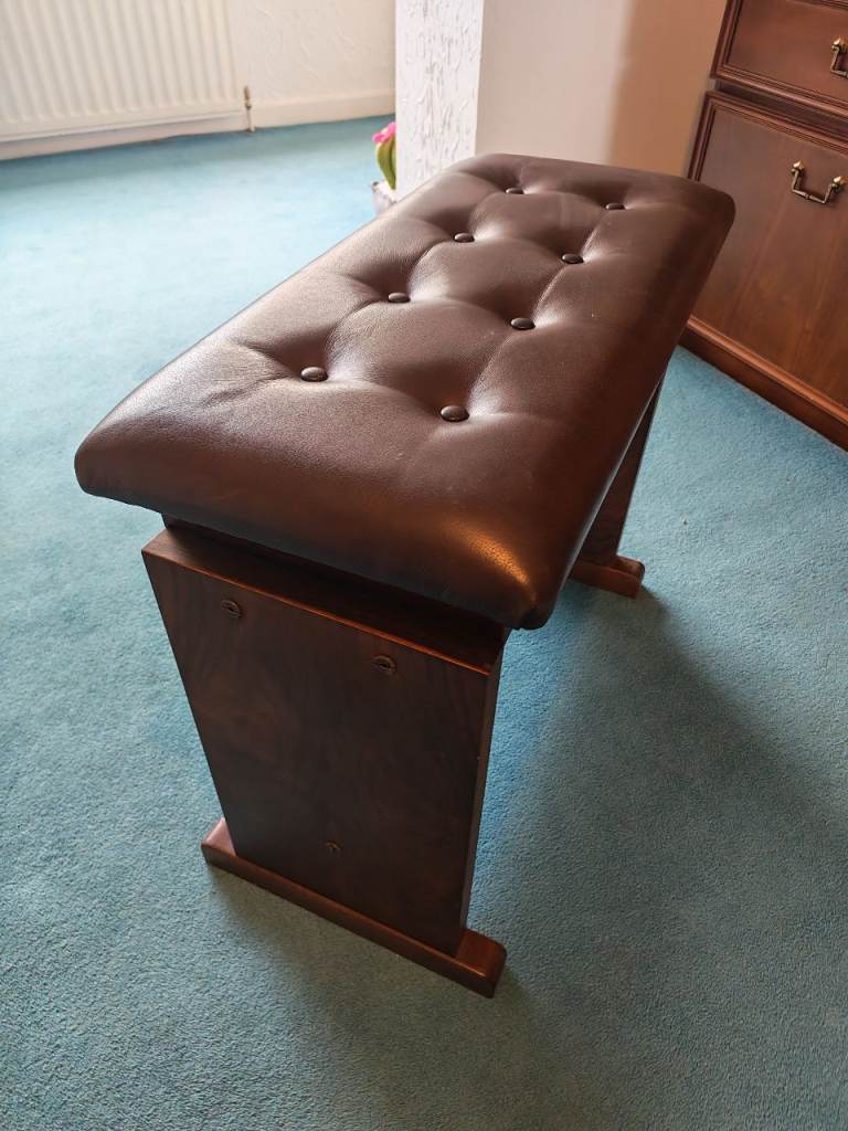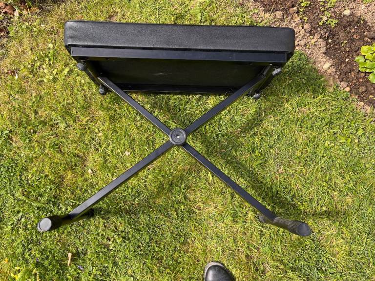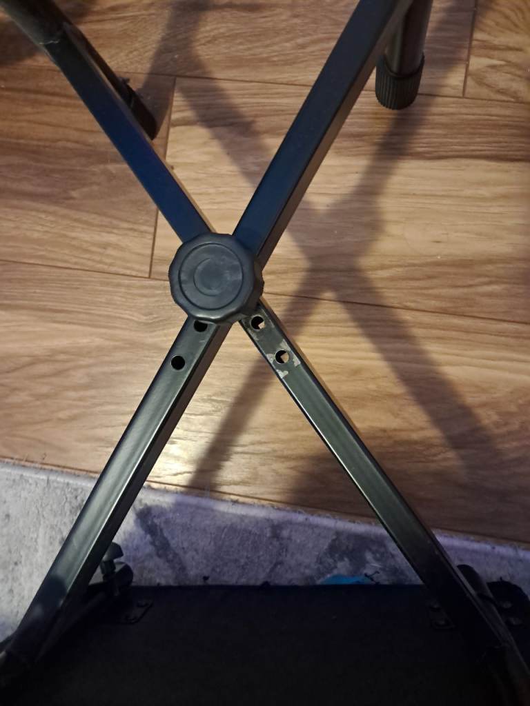 It has been owned for a couple years. Its around 18 inches tall, and the seat is 16 inches long at its longest side and then about 12 inches on the left and right in the pic. It is a bit uneven and can be wobbly when shifting, and this is the way it had come when i had gotten it. The height is adjustable. The seat itself is clearly worn down.