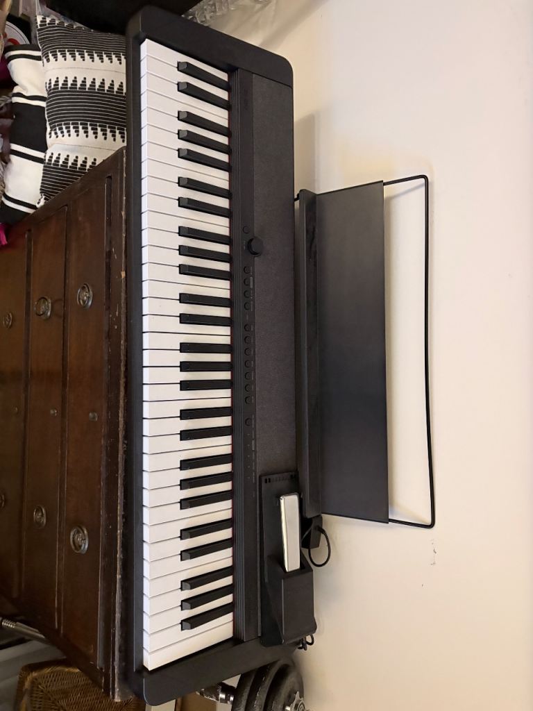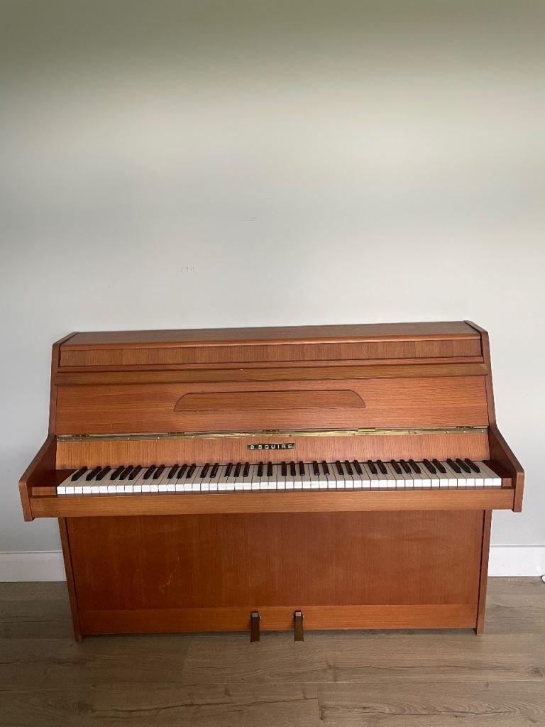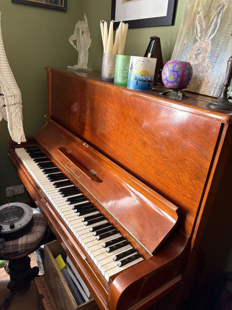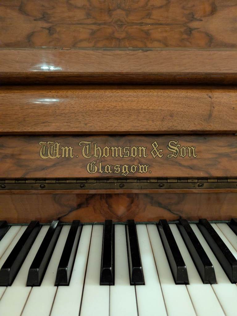 Wm. Thomson & Son upright piano in a beautiful walnut case. A classic Glasgow-made instrument with a lovely decorative grain, ideal for a beginner, learner, or as a statement furniture piece.