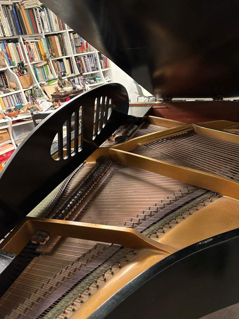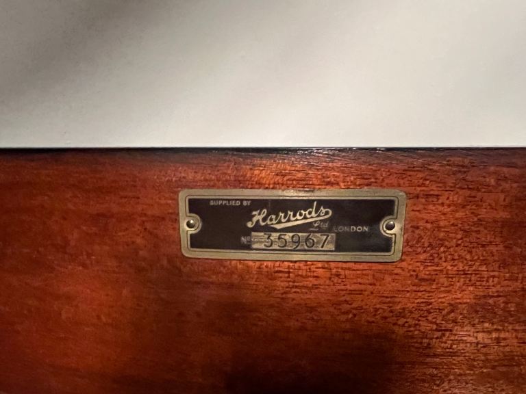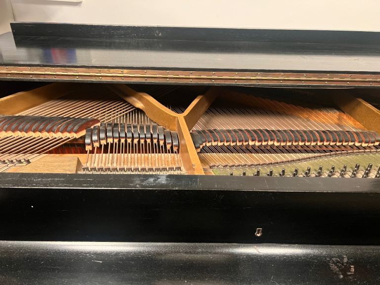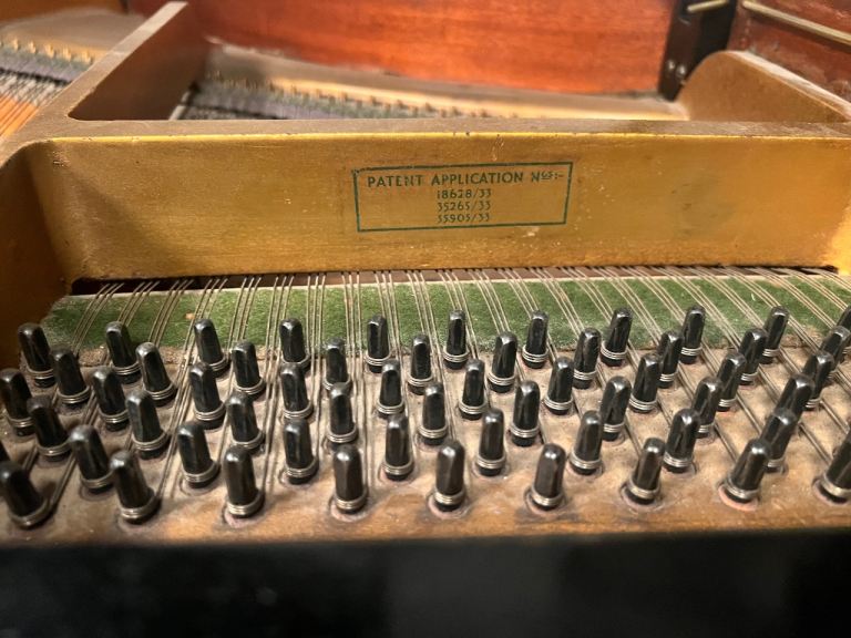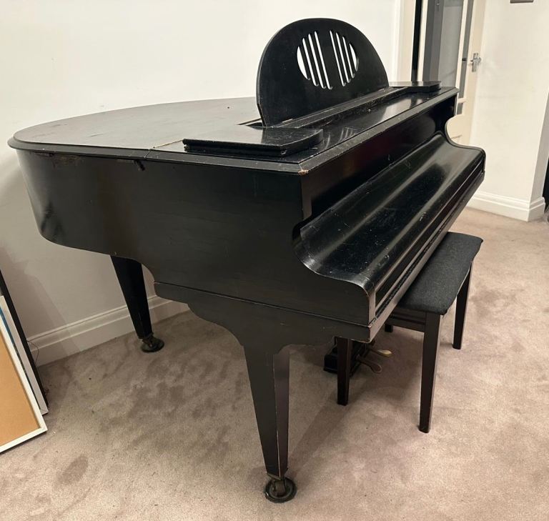 This baby grand piano was originally bought in Harrods in 1934. Some of the outer surface has scratches and some of the keyboards have tiny chips on the edges. Tuning required. Hammers are worn.
